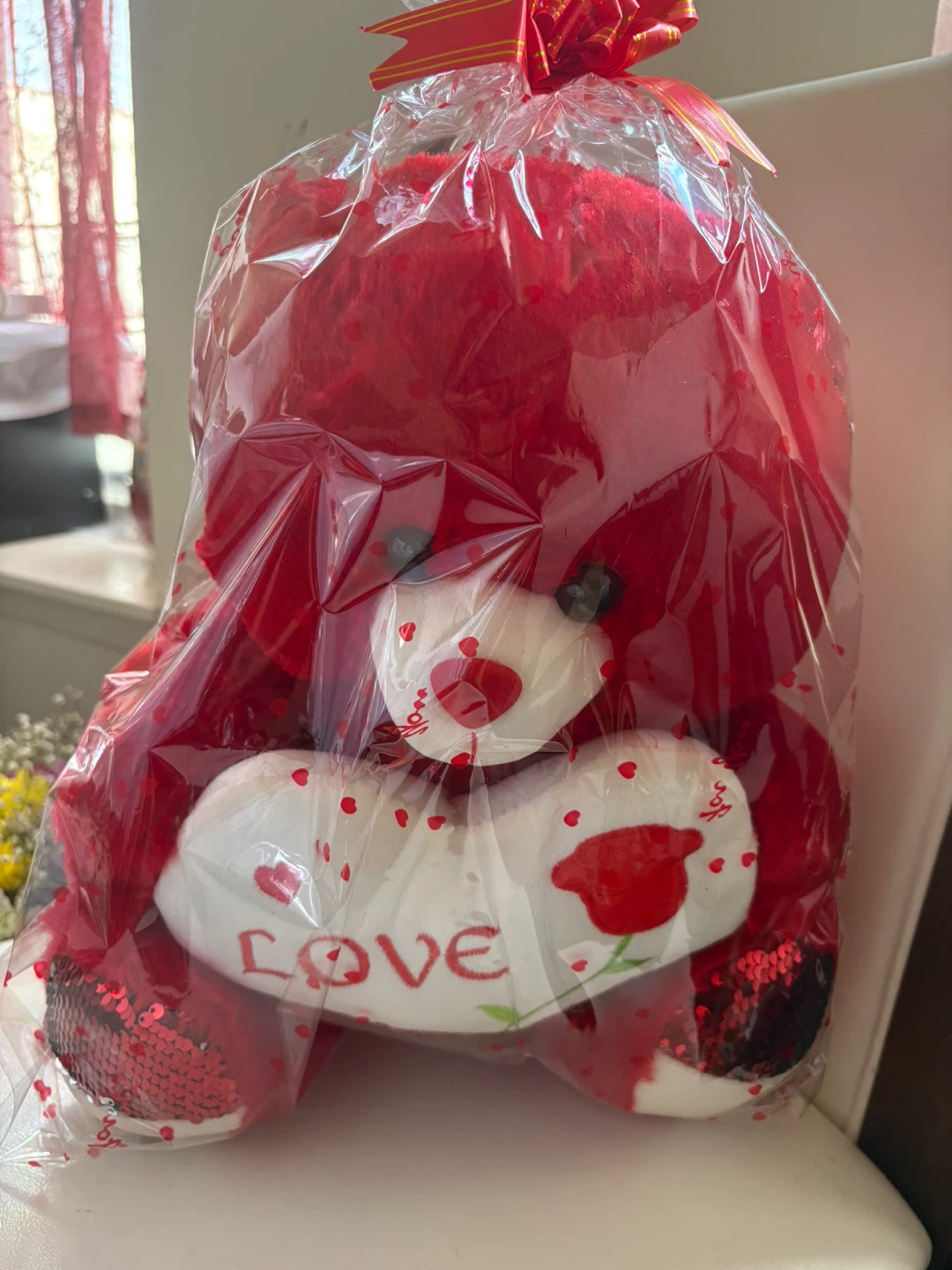 This adorable red teddy bear It’s features a soft plush body and hold a heart-shaped pillow with 'Love' printed on it. The bear's paws and feet are adorned with red sequins, adding a festive touch. It's a sweet gift for someone special! “Dimensions: 40 cm (15.75 in).”