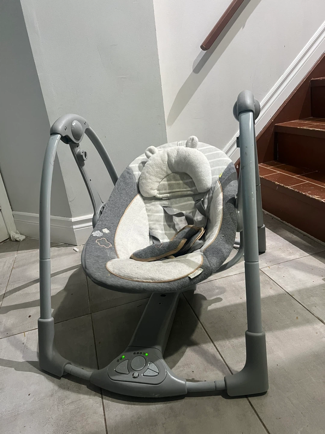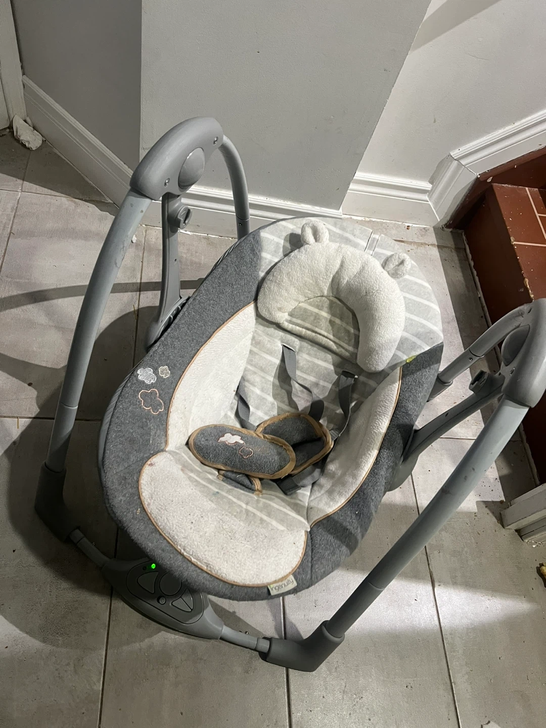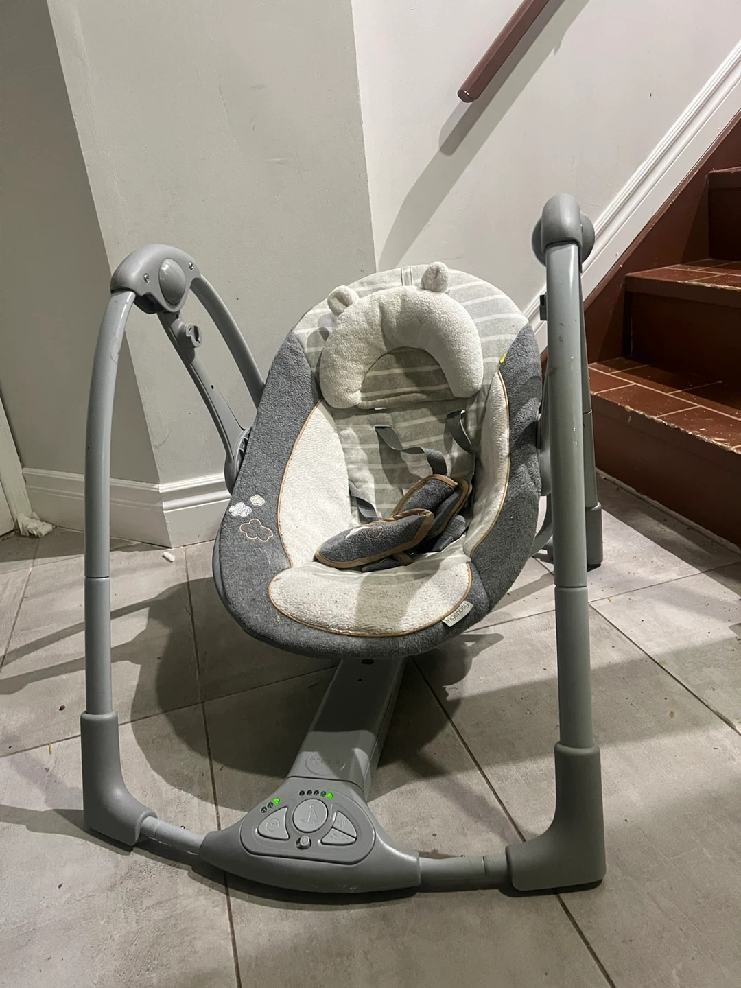 This is a gently used Graco baby swing in a neutral grey and white stripe pattern. It features a comfortable padded seat with a head support and a 5-point harness. The swing has multiple speed settings and gentle motion to soothe your little one.