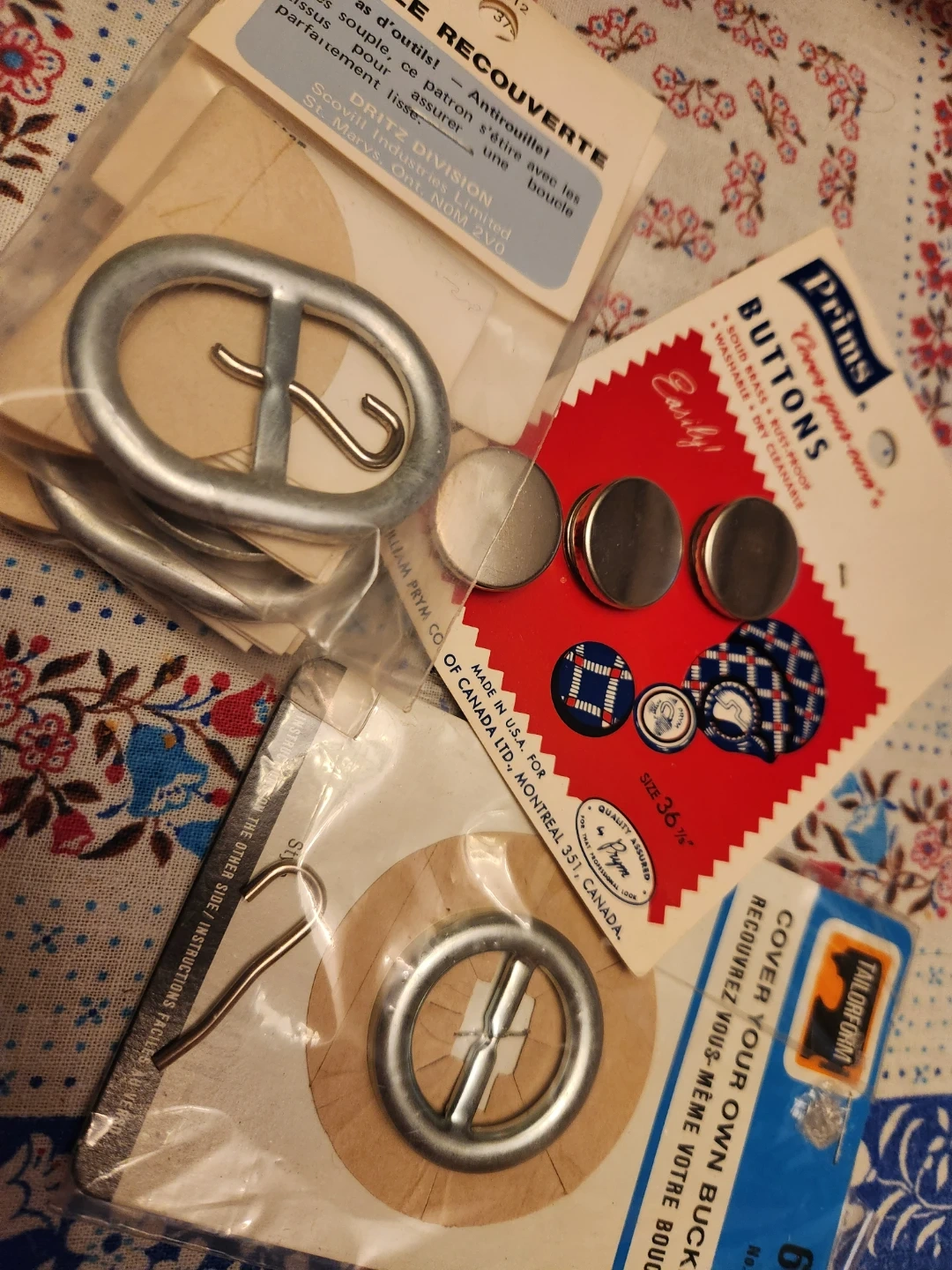 A bundle of sewing notions including Prym 'cover-your-own' buttons, size 36. Also includes Dritz coverable buckles and a Tailorform cover your own buckle kit.