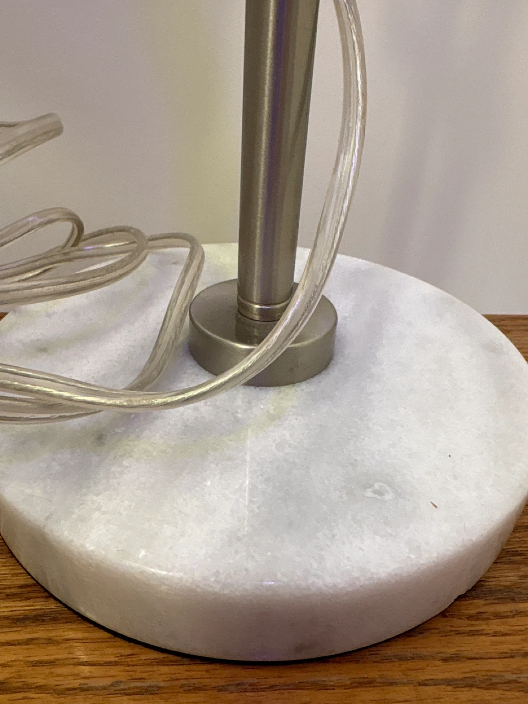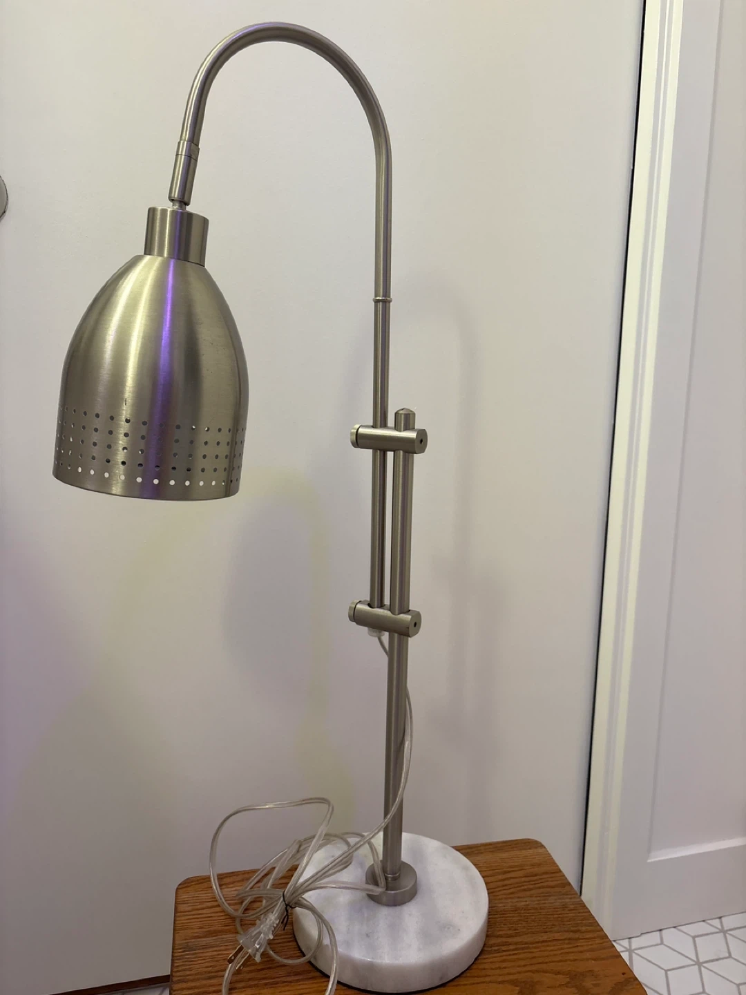 This desk lamp features a brushed nickel finish and a gooseneck design for adjustable lighting. It has a marble base for stability. Perfect for task lighting at your desk or workspace!