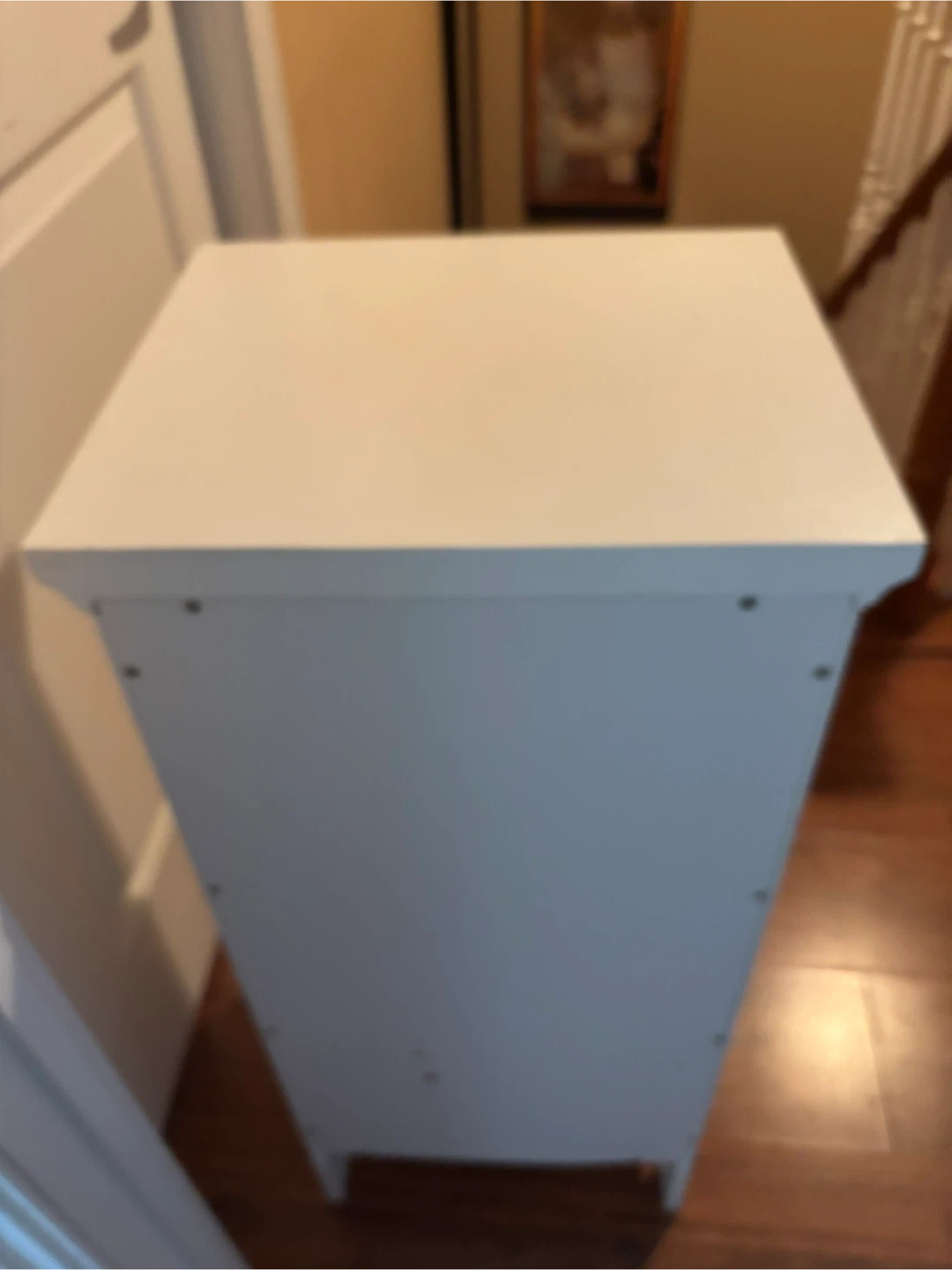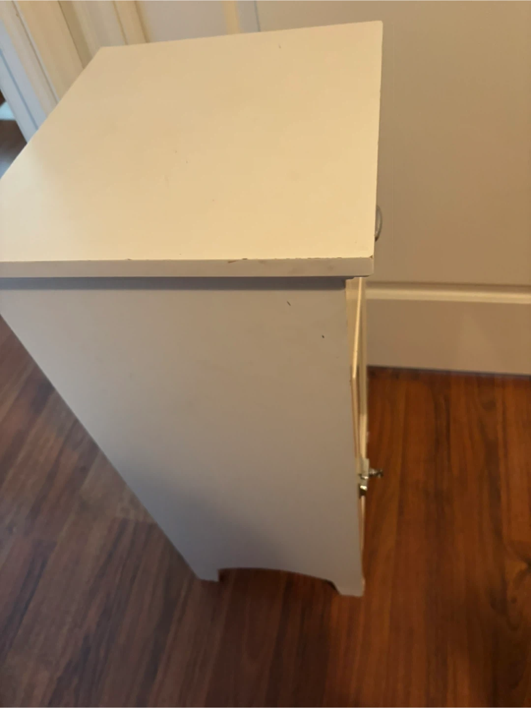 White small cabinet/nightstand in like new conditions. The cabinet door features a glass panel, revealing two shelves inside. It's perfect for storing bedside essentials or small decorative items. The cabinet provides a handy spot for items you want to keep out of sight.