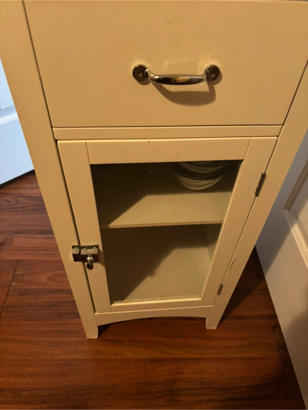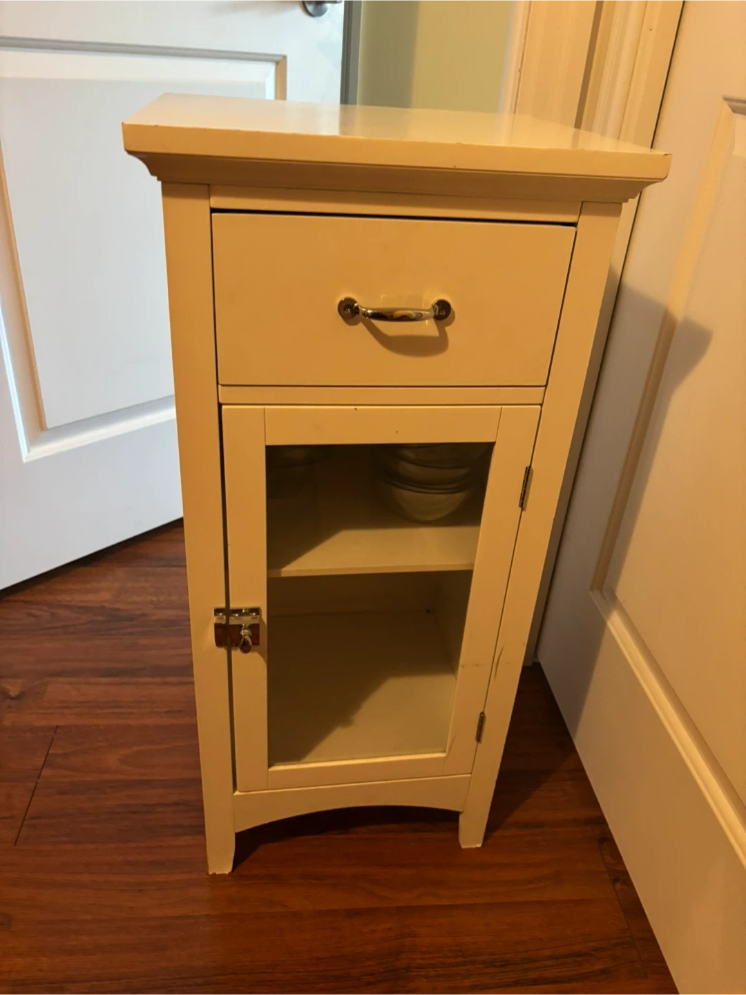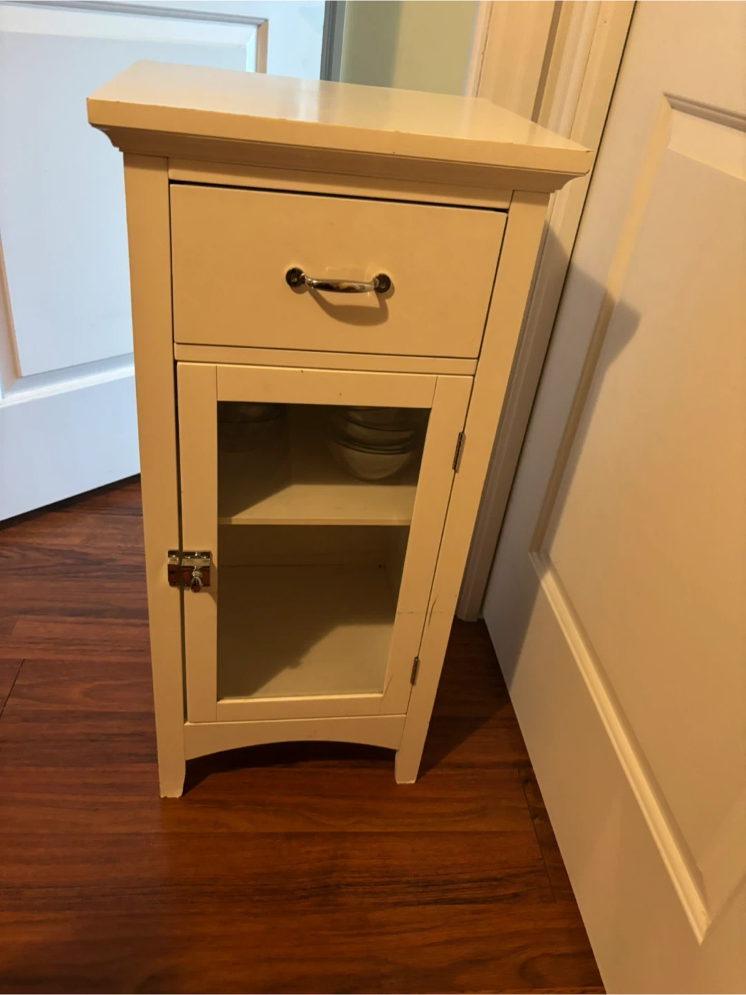 White small cabinet/nightstand with drawer and glass door