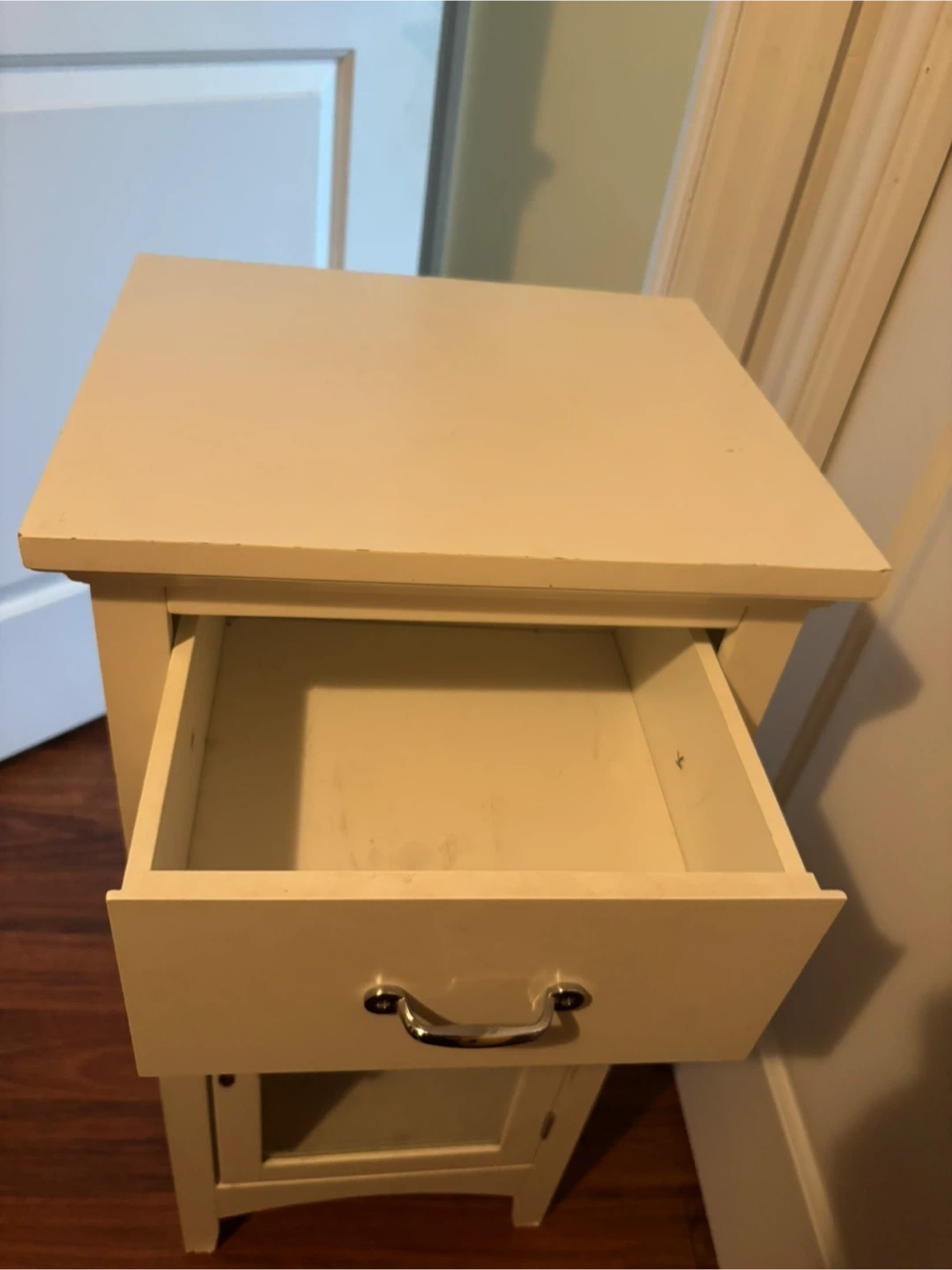 White small cabinet/nightstand in like new conditions. The cabinet door features a glass panel, revealing two shelves inside. It's perfect for storing bedside essentials or small decorative items. The cabinet provides a handy spot for items you want to keep out of sight.