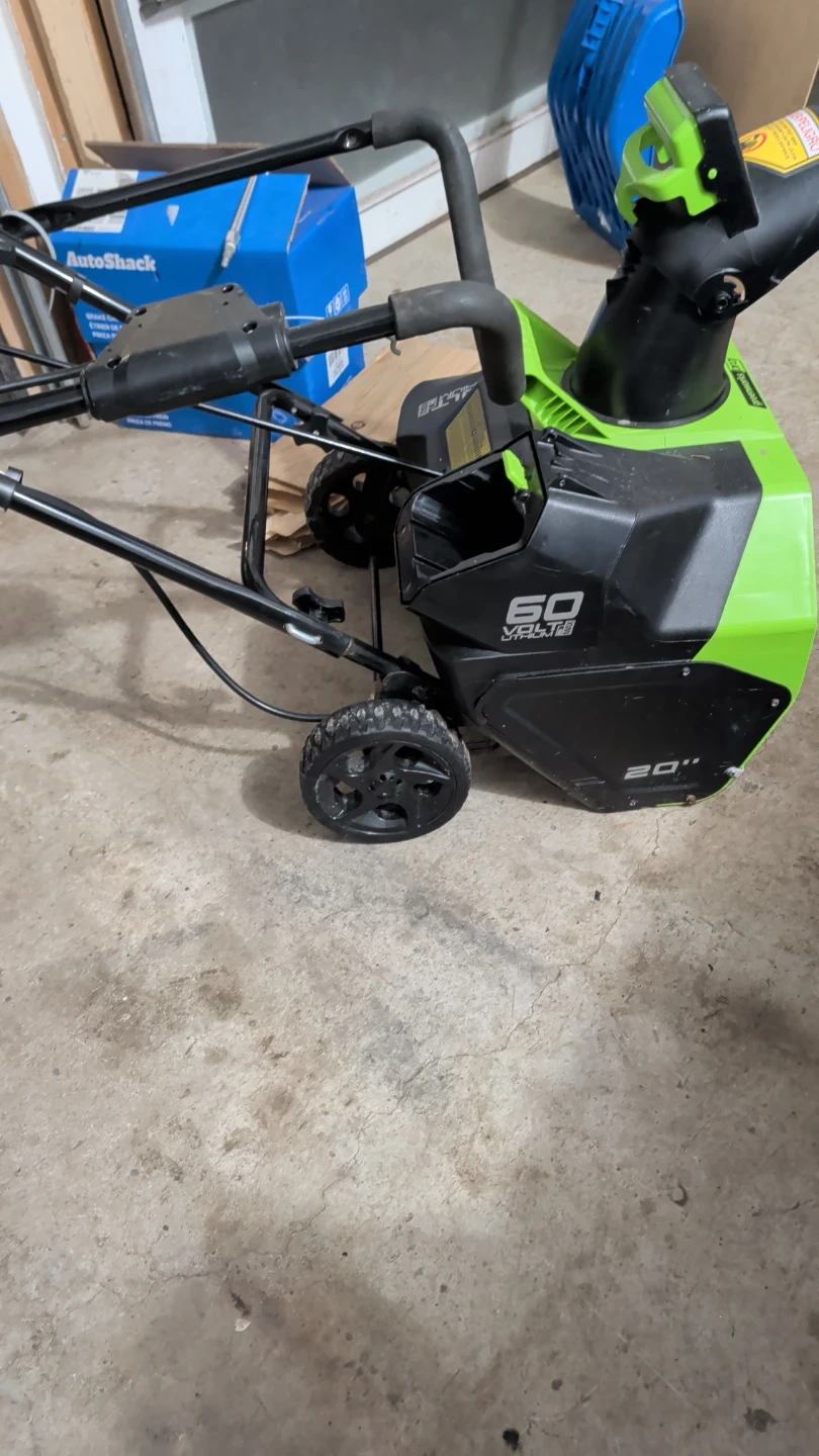 This is a Greenworks PRO 60V Lithium snowblower. It features a 20" clearing width. This snowblower is great for clearing driveways and walkways. Condition unknown do not have battery or charger. Lost cover for battery housing and metal handlebar piece.