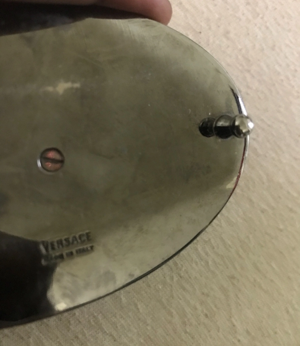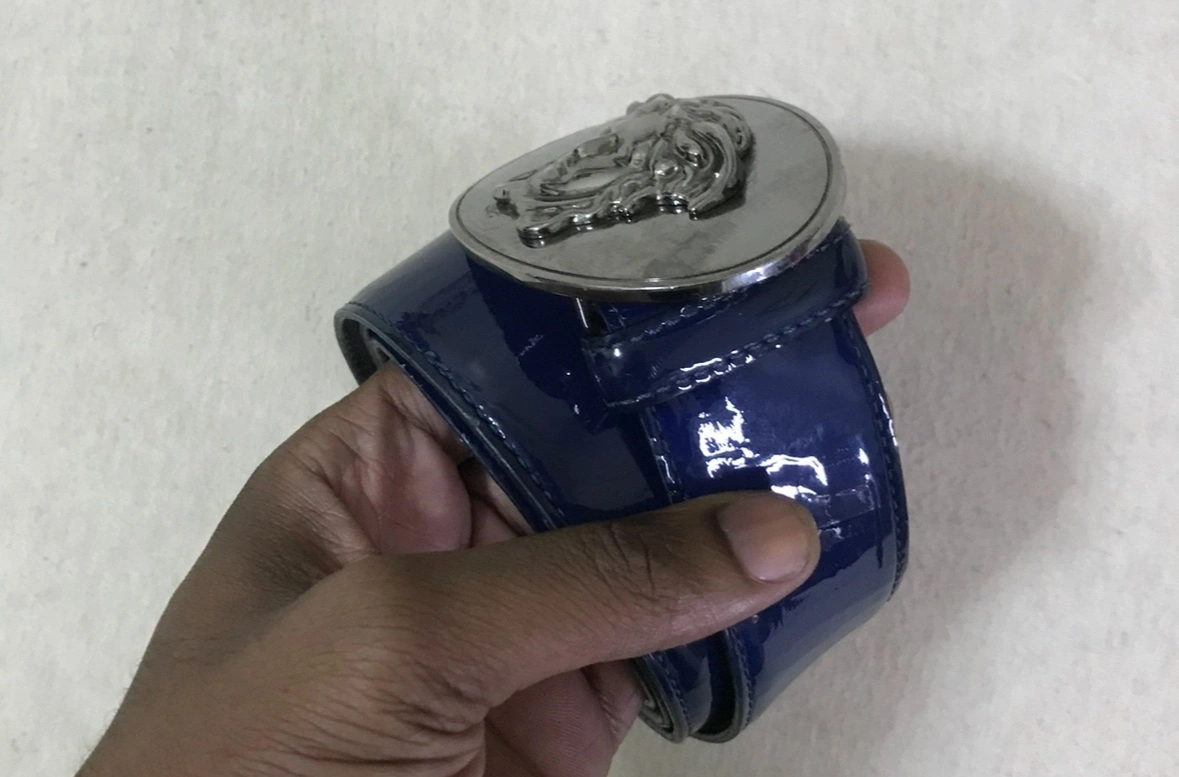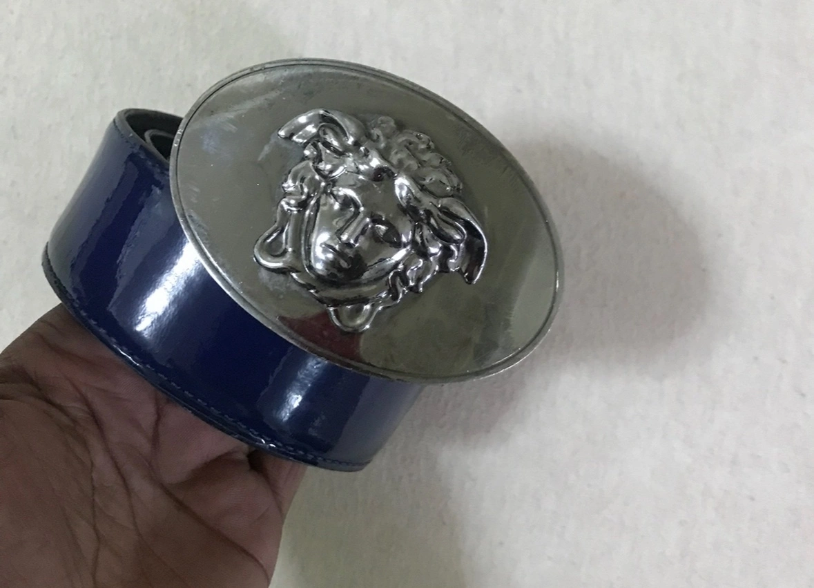 Size 85 (30-34). Blue patent leather Medusa head Versace belt. No rips or tears, great condition. Authentic
