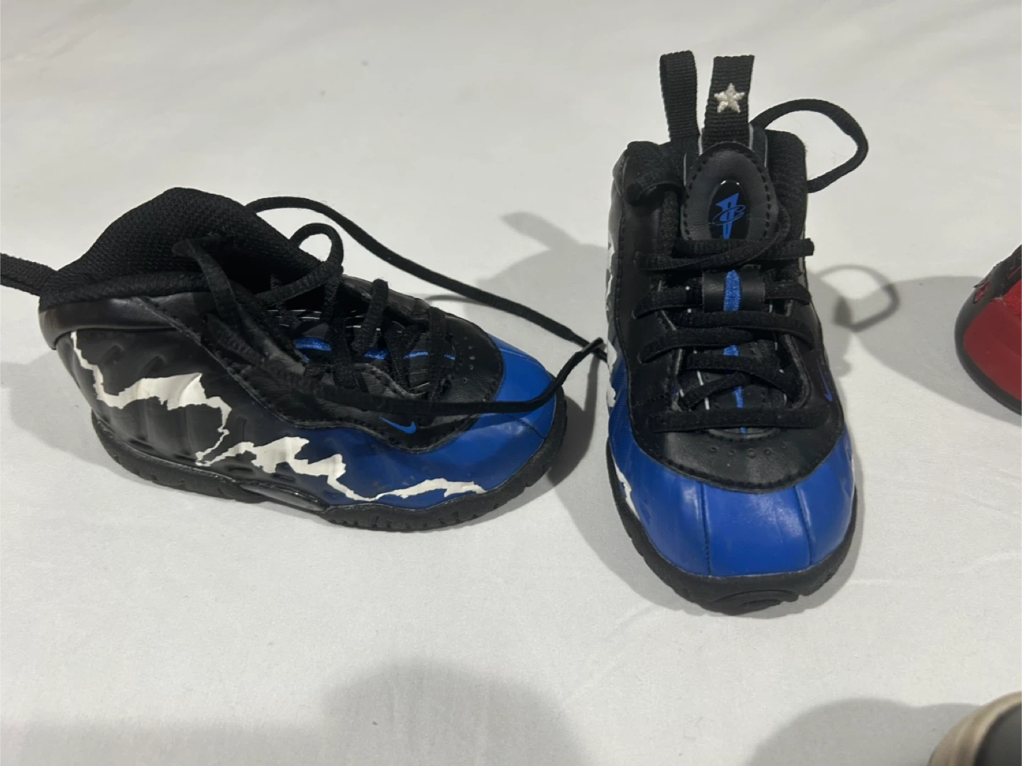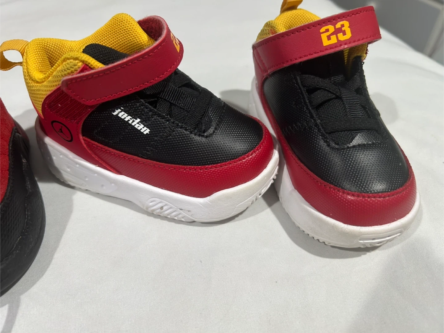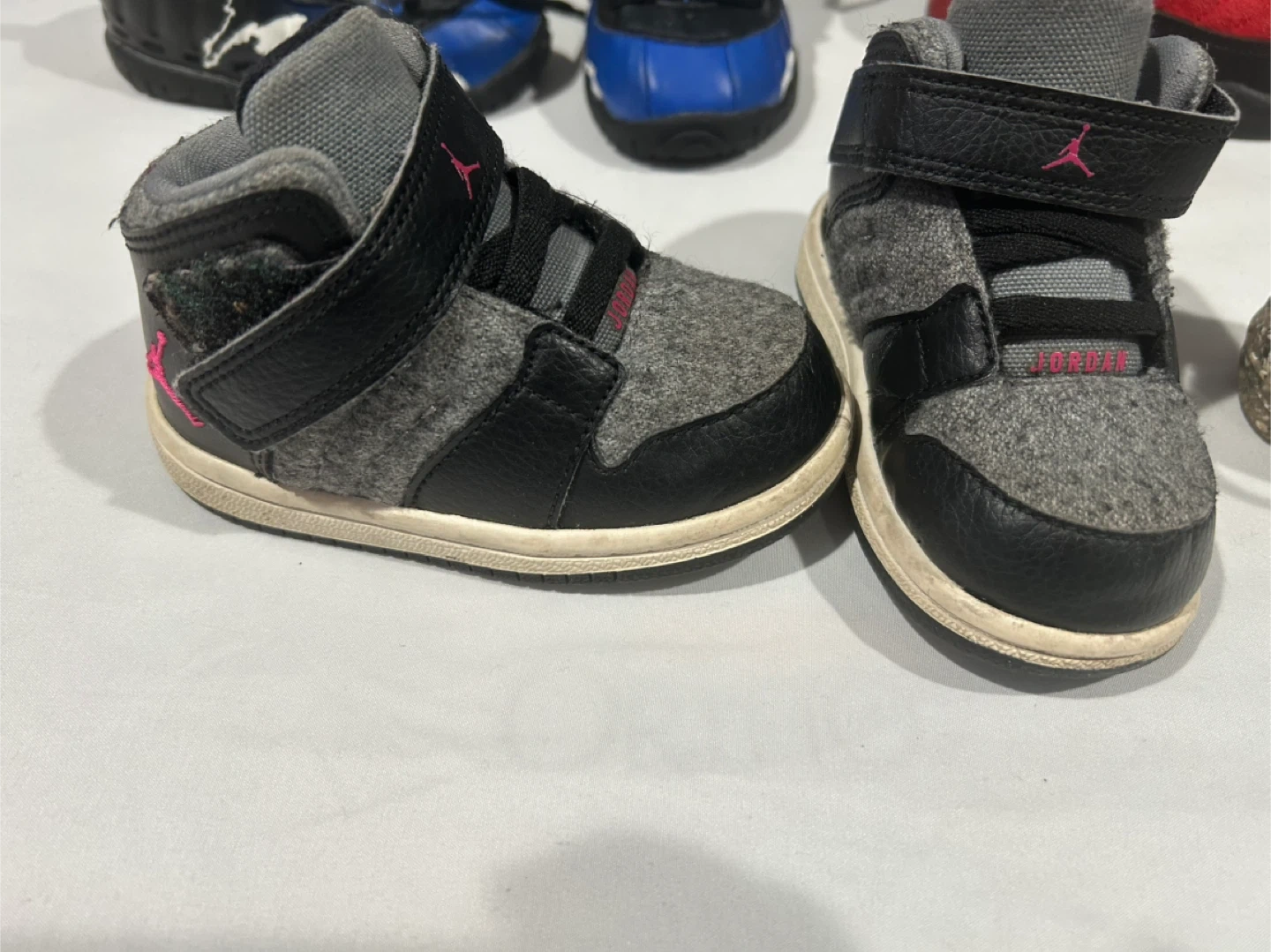 Collection of children's sneakers including several Jordan models and Nike Air Force 1s. Features various colors and styles suitable for young kids. Sizes 5c