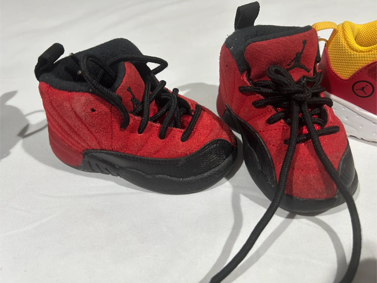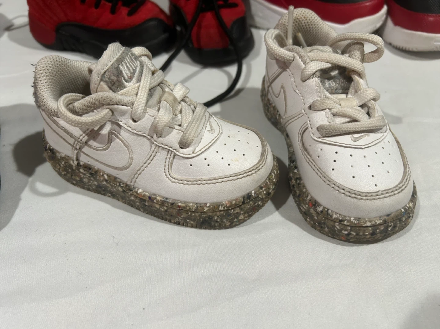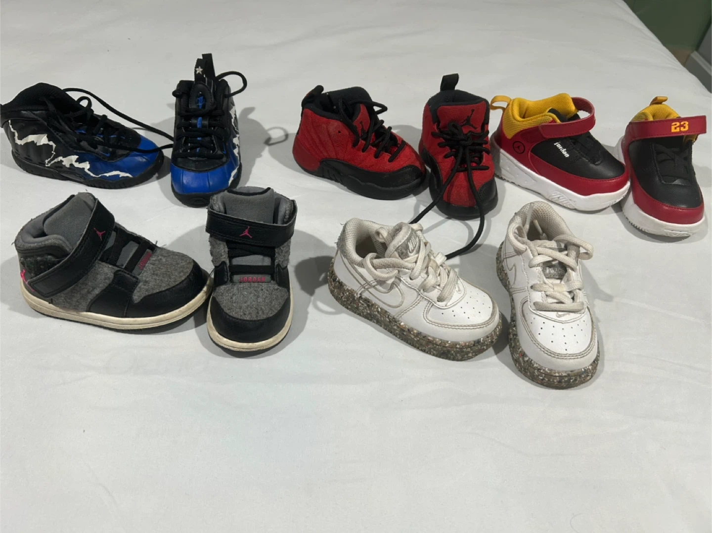 Collection of children's sneakers including several Jordan models and Nike Air Force 1s. Features various colors and styles suitable for young kids. Sizes 5c