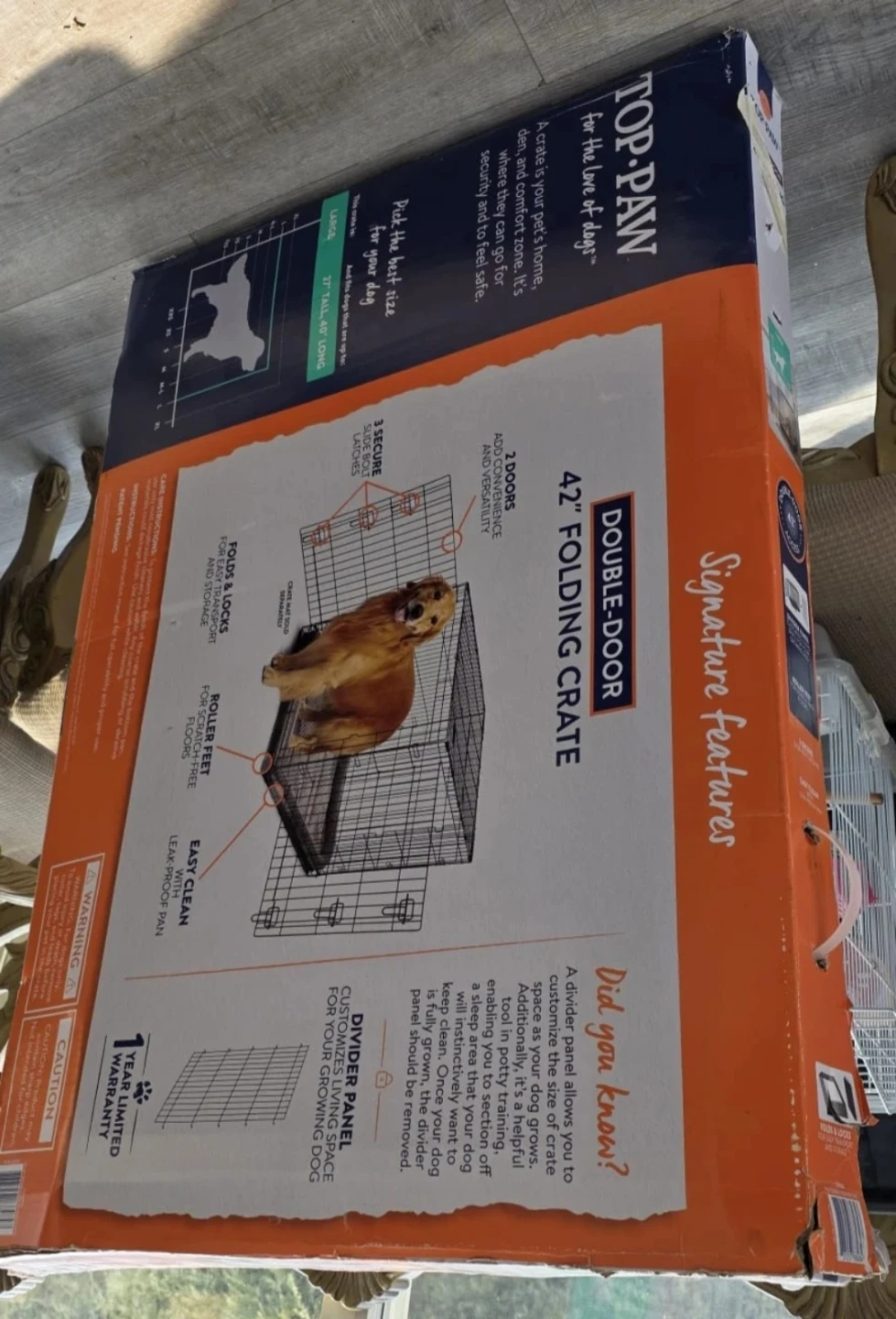 This is a 42-inch double-door folding dog crate from TOP-PAW. It features two doors for convenience and versatility. It also includes a divider panel for customizing living space and roller feet for scratch-free floors.