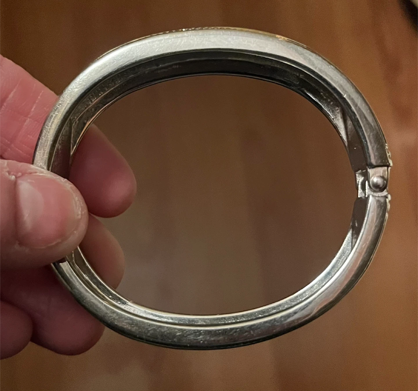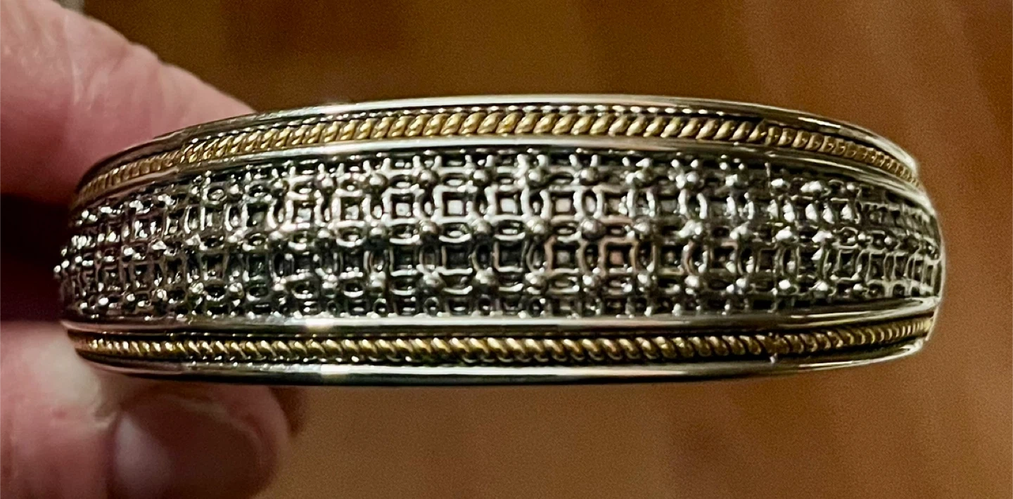 Selling a stylish two-tone hinged bangle bracelet. It features a silver and gold design with intricate detailing. A lovely accessory to add to your collection!