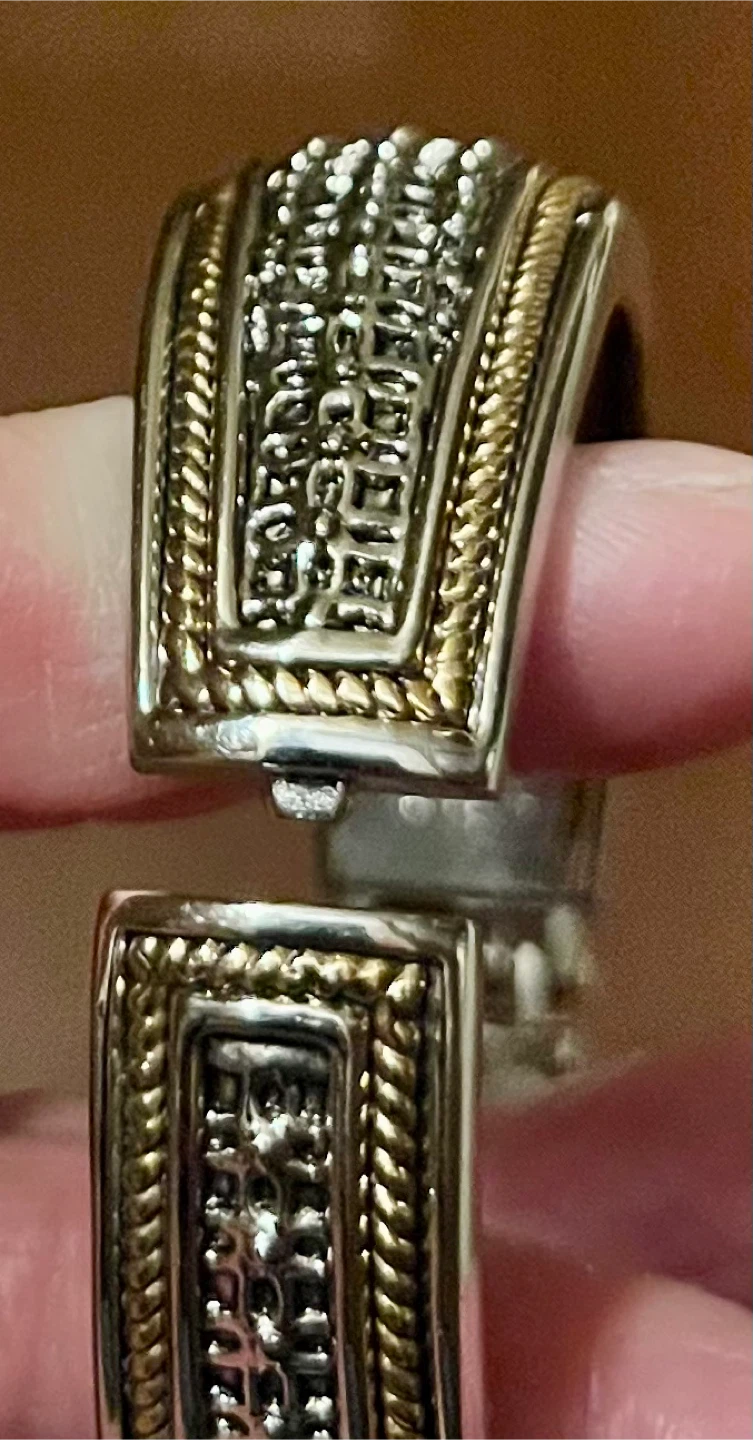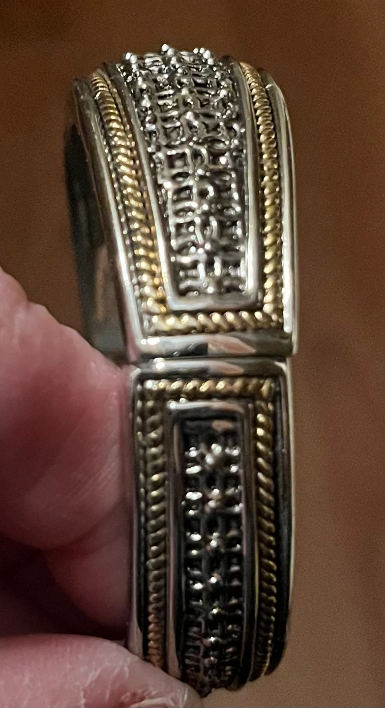 Selling a stylish two-tone hinged bangle bracelet. It features a silver and gold design with intricate detailing. A lovely accessory to add to your collection!