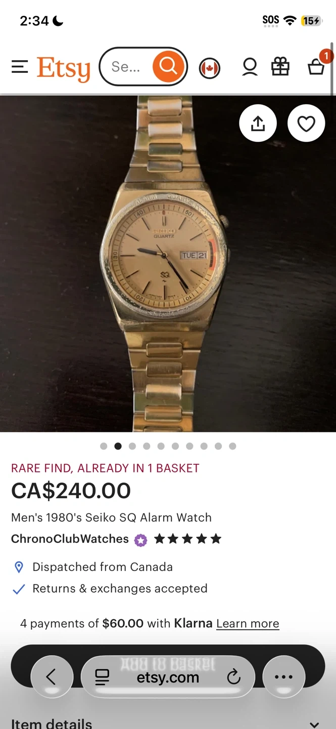 This is a men's Seiko SQ Alarm Quartz watch. It's gold-toned with a champagne dial. Features include a day and date display.