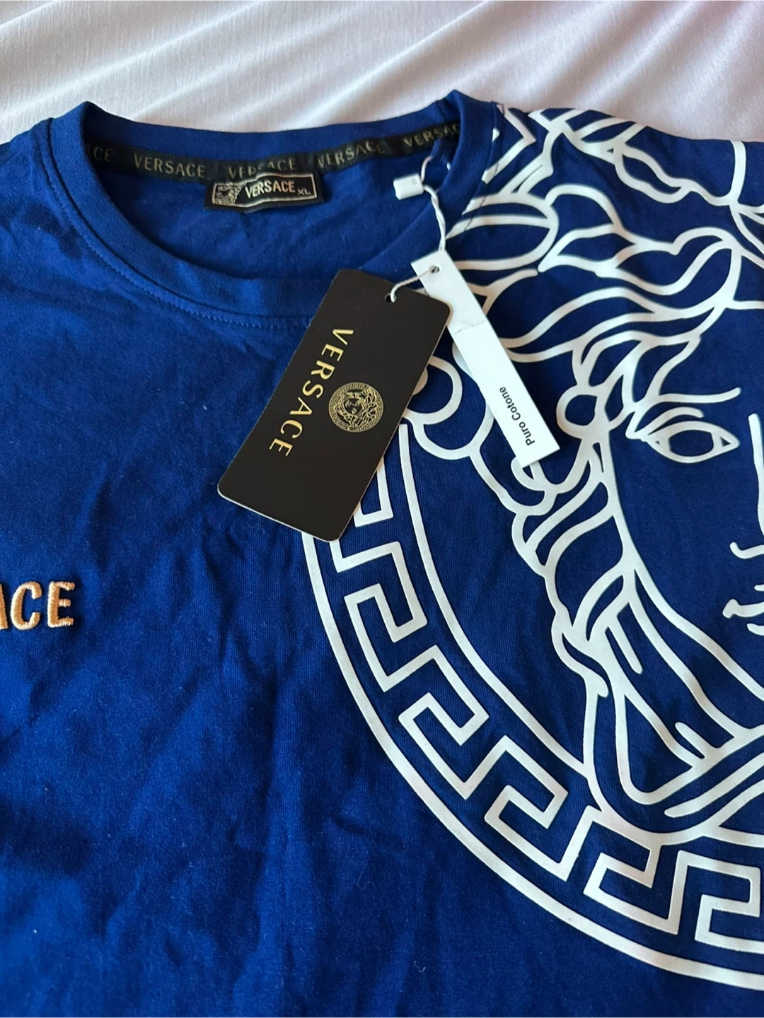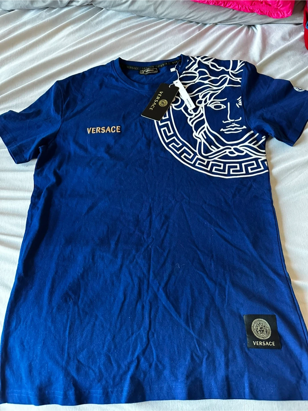 Blue Versace t-shirt with iconic Medusa graphic. It's made of cotton and comes with original tags. A stylish piece for anyone who appreciates designer wear.