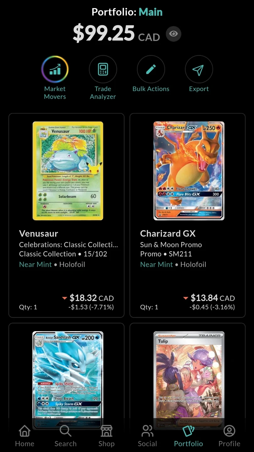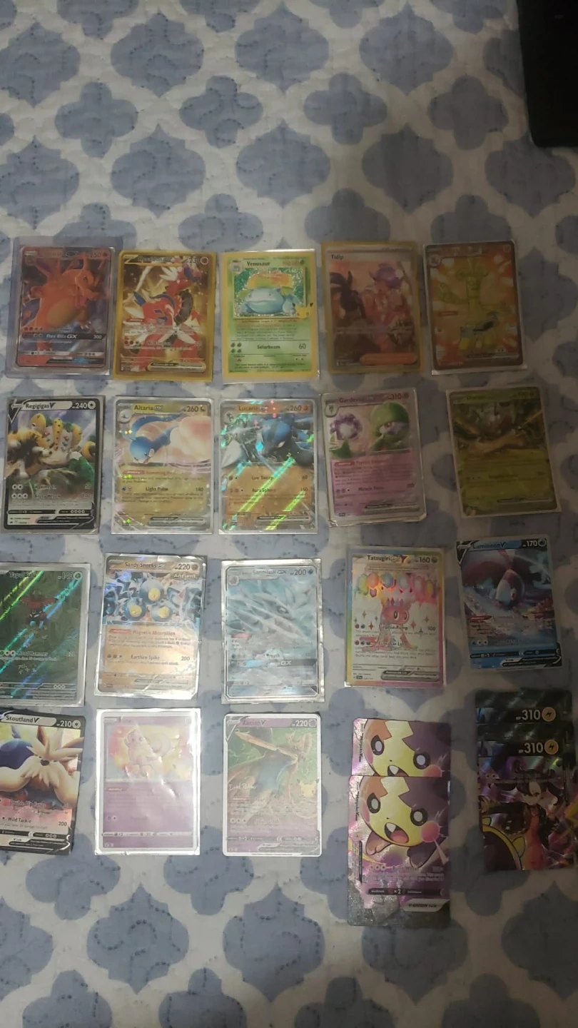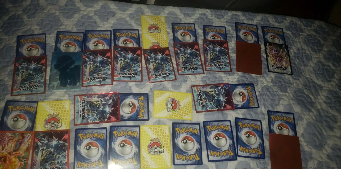 Collection of various Pokémon and Digimon trading cards. Includes cards like Venusaur, Charizard GX, and more. Cards are in near mint condition. Great for collectors!