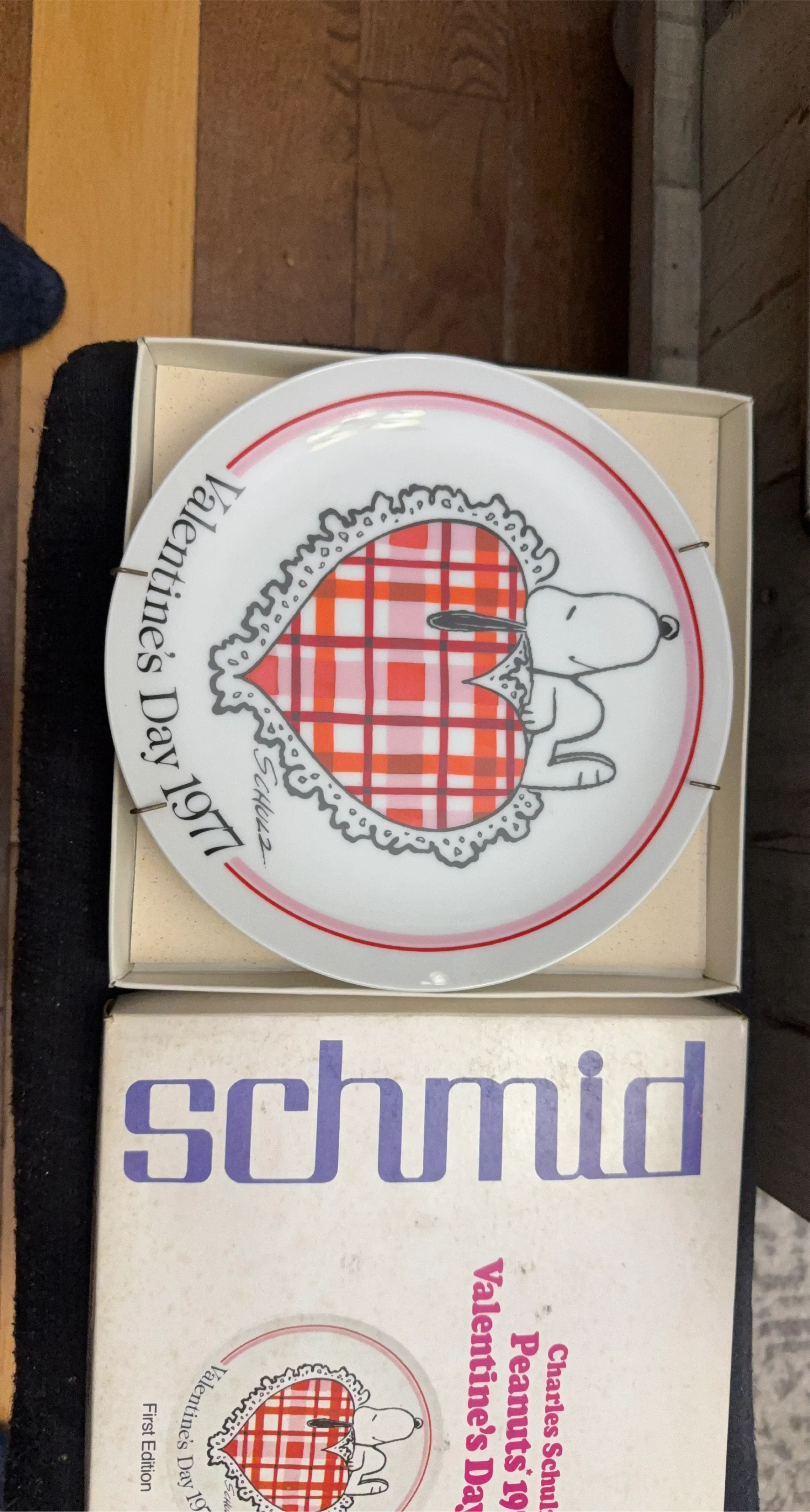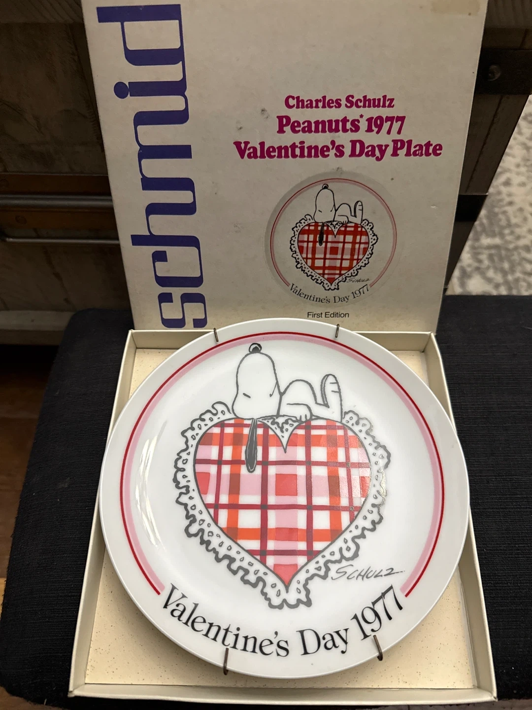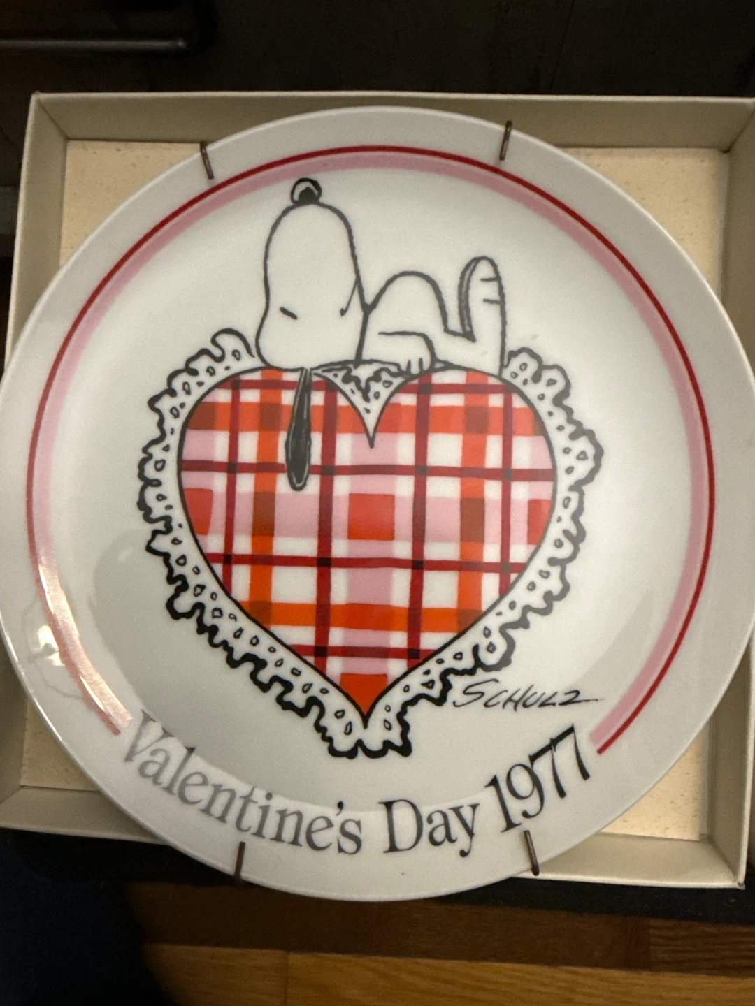 This is a 1977 Vintage Peanuts Valentine's Day plate featuring Snoopy. It's a First Edition from The Schmid Collection. The plate is decorative and not for food consumption. $20.