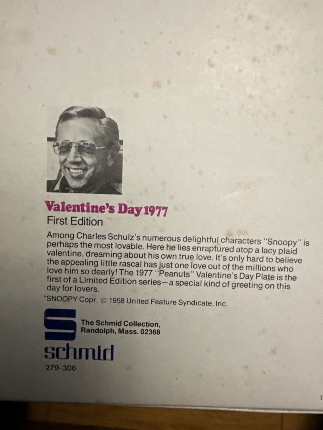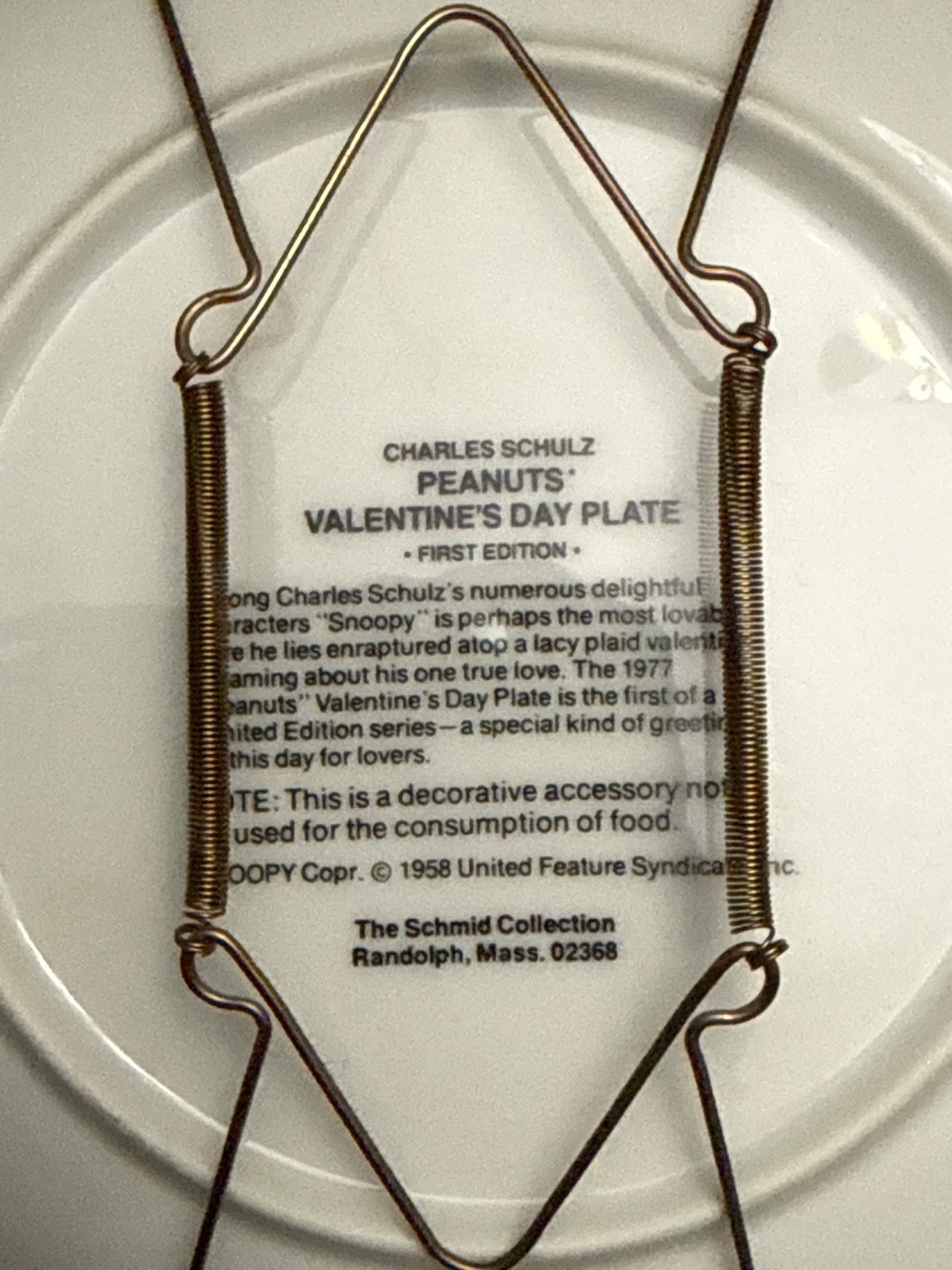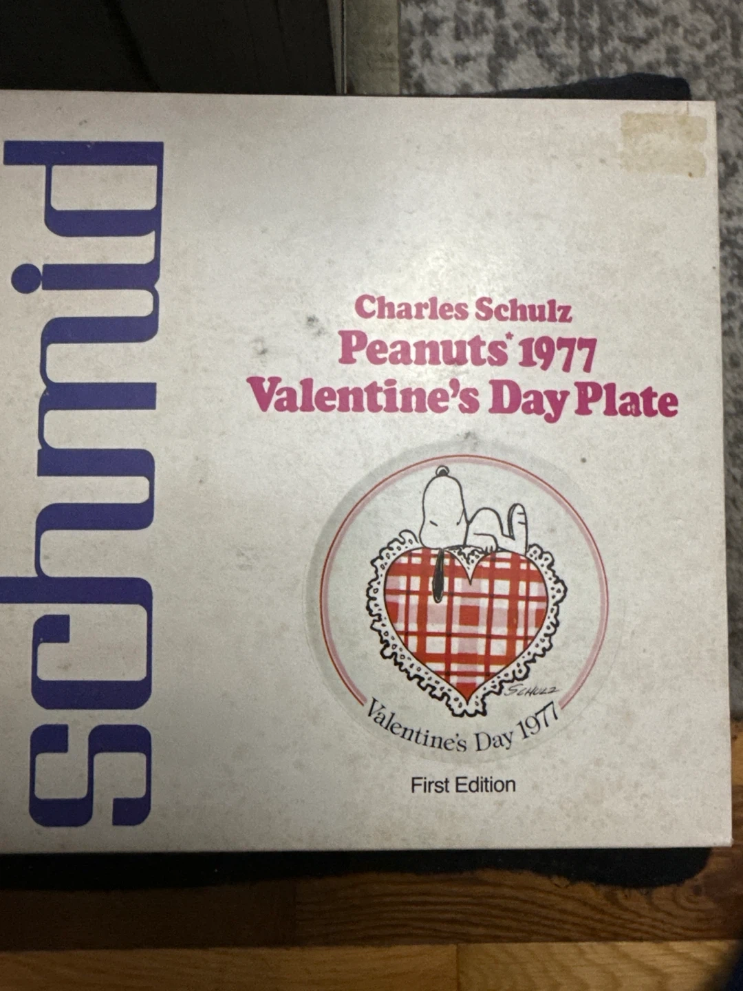 This is a 1977 Vintage Peanuts Valentine's Day plate featuring Snoopy. It's a First Edition from The Schmid Collection. The plate is decorative and not for food consumption. $20.