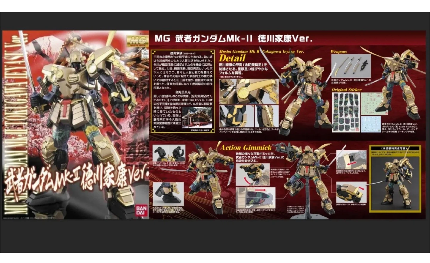 This is a Master Grade model kit of the Musha Gundam Mk-II in the Tokugawa Ieyasu Ver. It comes with weapons and original stickers for customization. It's a detailed model for collectors and hobbyists.