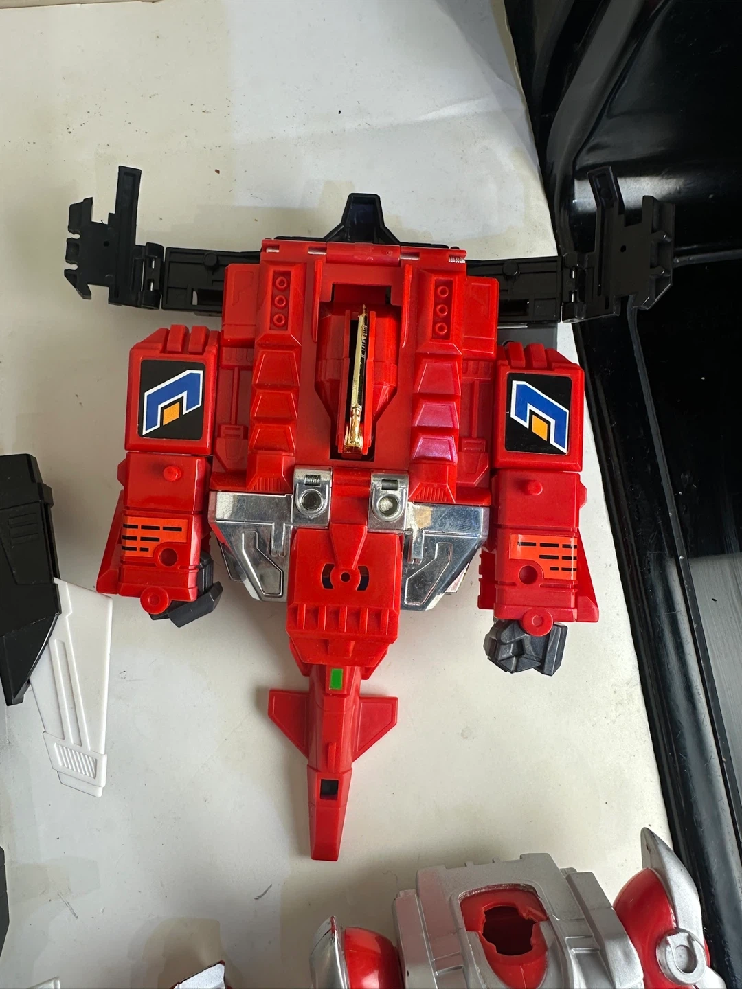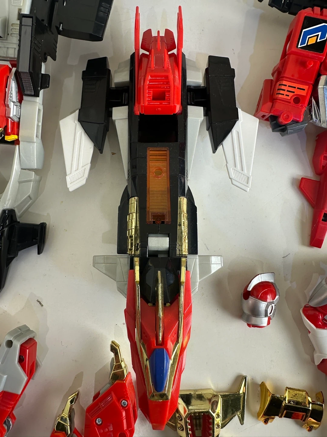Collection of vintage Vintage 1990's Superhuman Samurai Syber Squad Drago Dragon Parts robot toys. Includes multiple robot components and vehicle parts for assembly or display. Great for collectors or fans of classic mecha toys!