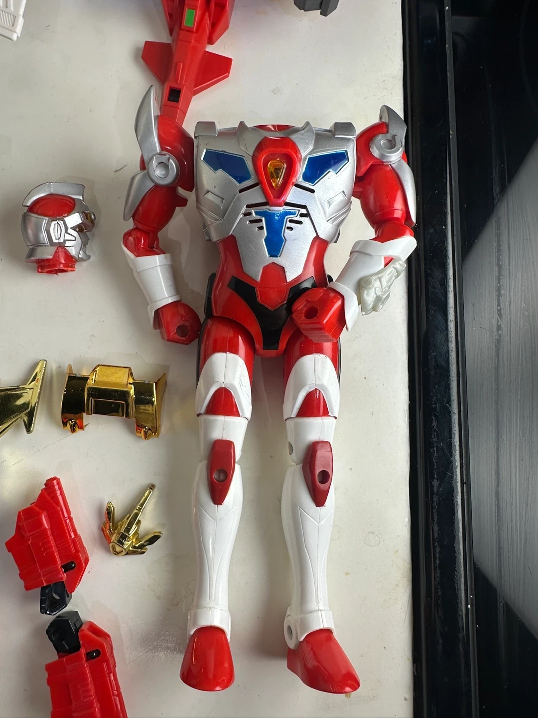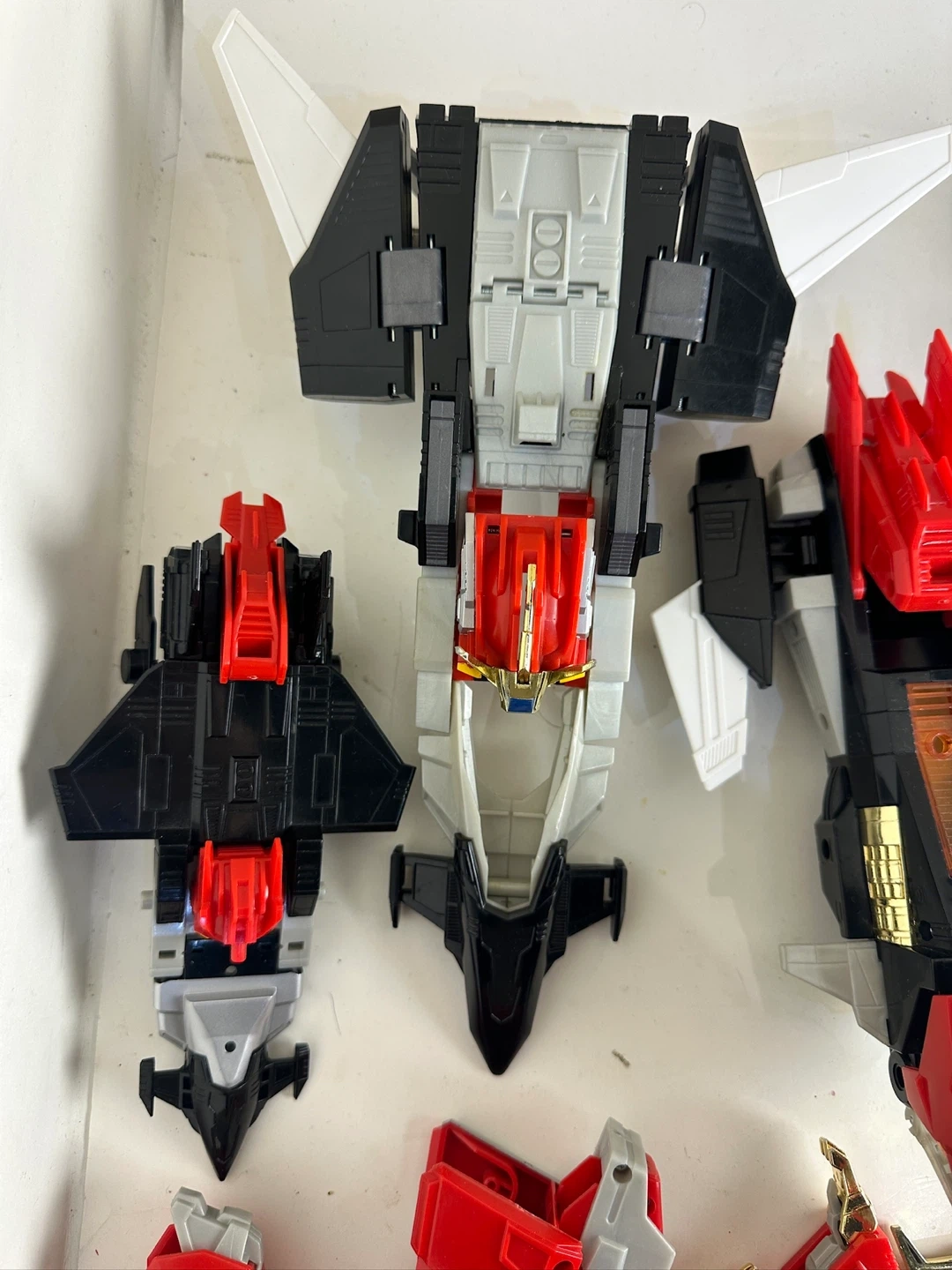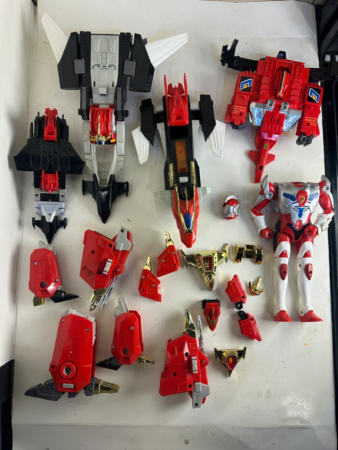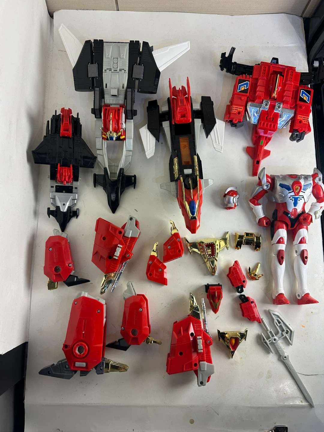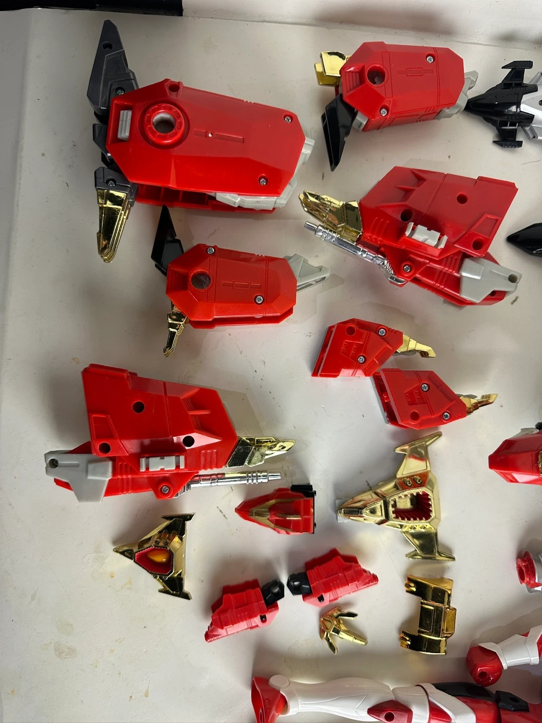 Collection of vintage Vintage 1990's Superhuman Samurai Syber Squad Drago Dragon Parts robot toys. Includes multiple robot components and vehicle parts for assembly or display. Great for collectors or fans of classic mecha toys!