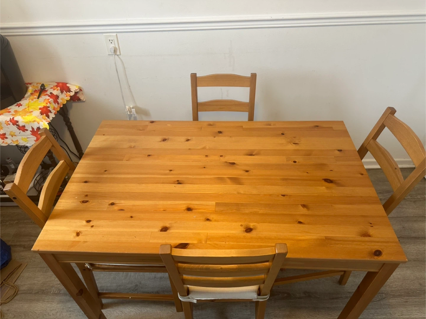 This is a sturdy IKEA dining set with a light wood finish. It includes one table and four chairs, each with a simple, clean design. The set is well-suited for smaller dining areas or eat-in kitchens.
