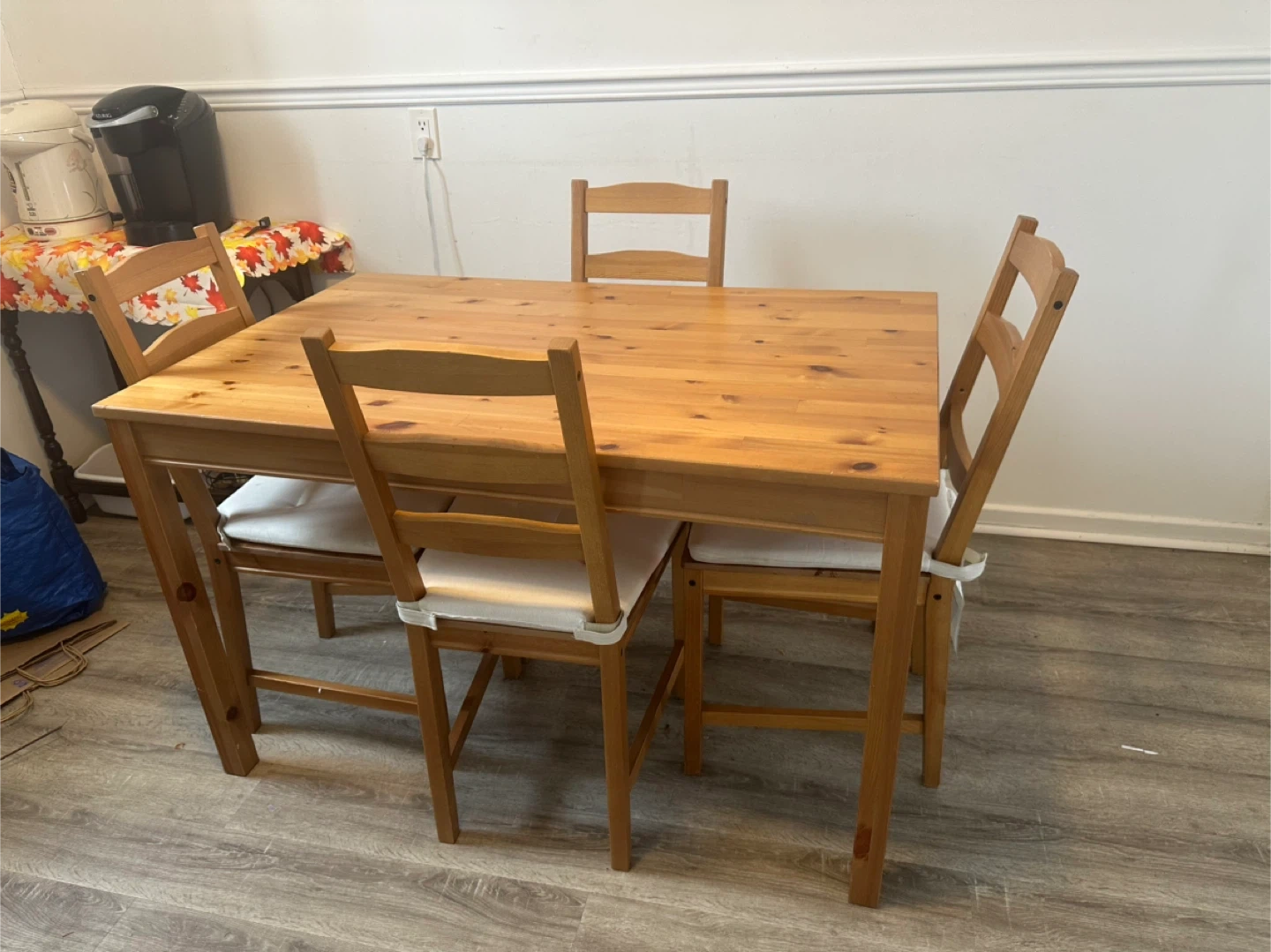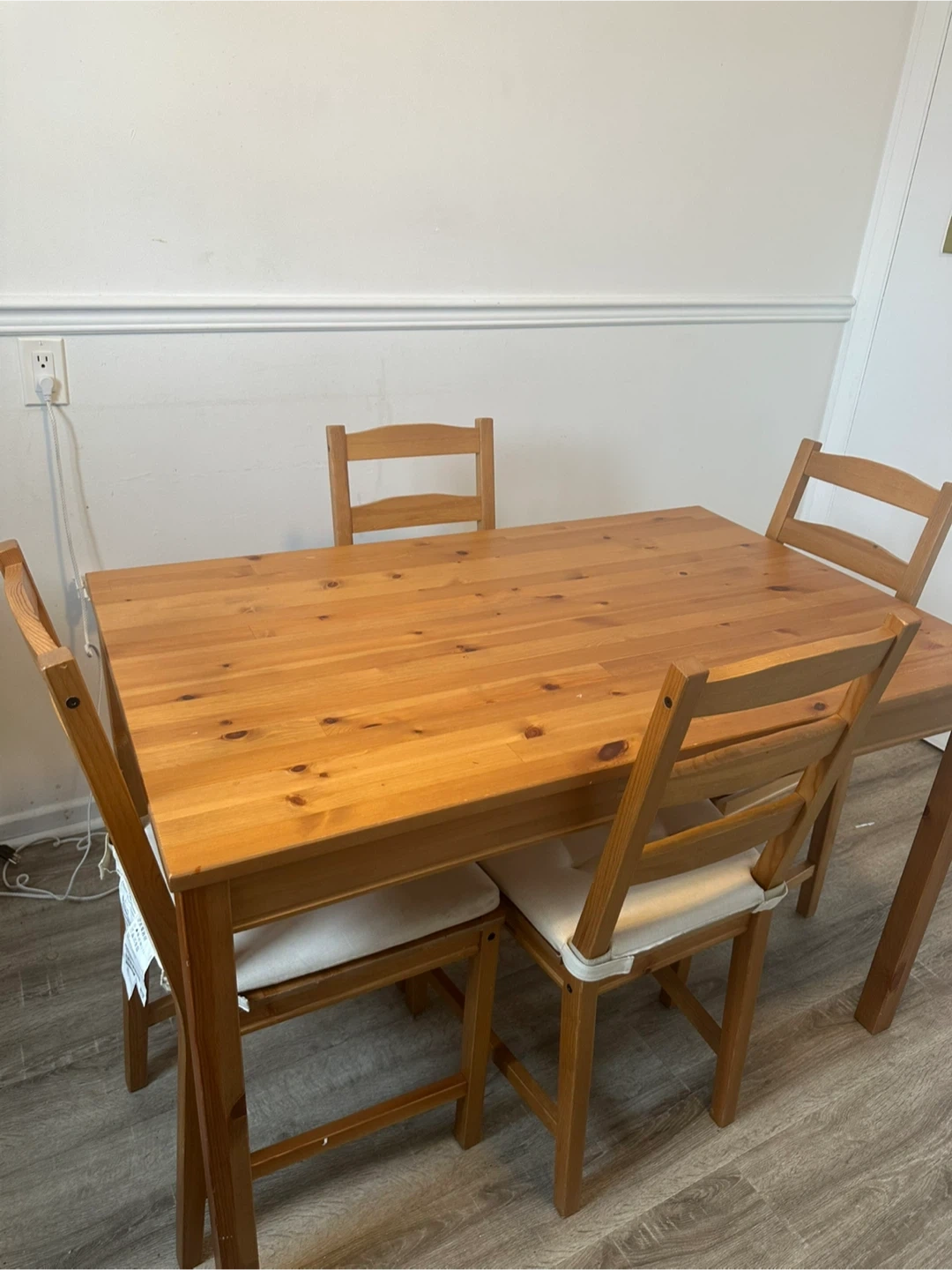 This is a sturdy IKEA dining set with a light wood finish. It includes one table and four chairs, each with a simple, clean design. The set is well-suited for smaller dining areas or eat-in kitchens.