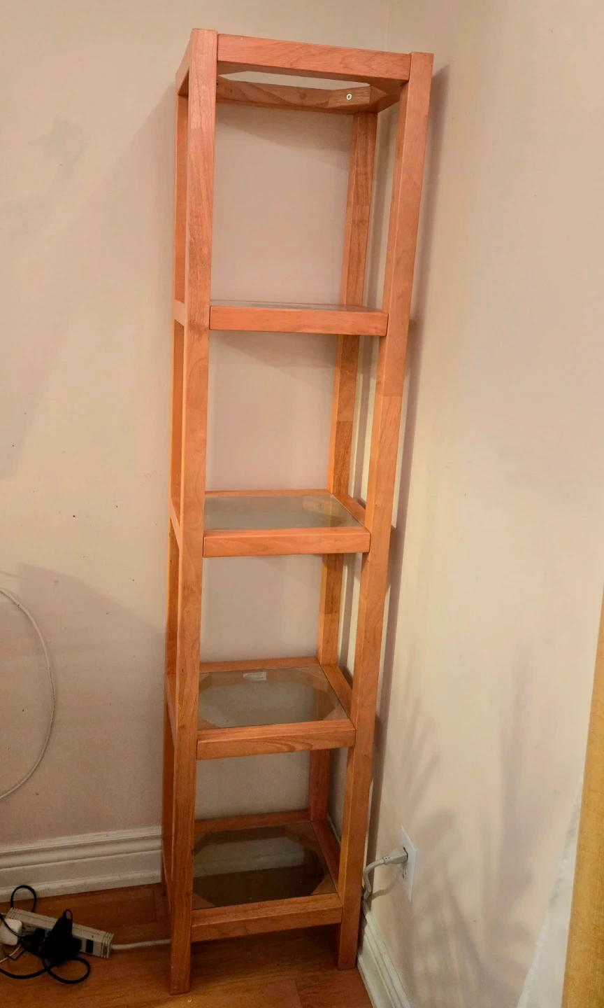 This is a slim, tall bookshelf with a light wood finish. It has 5 removeable, inset, glass shelves including the top of the shelf. It is low-profile at just 12" × 16" with a height of 72". Great for displaying photos, keepsakes, and decor.