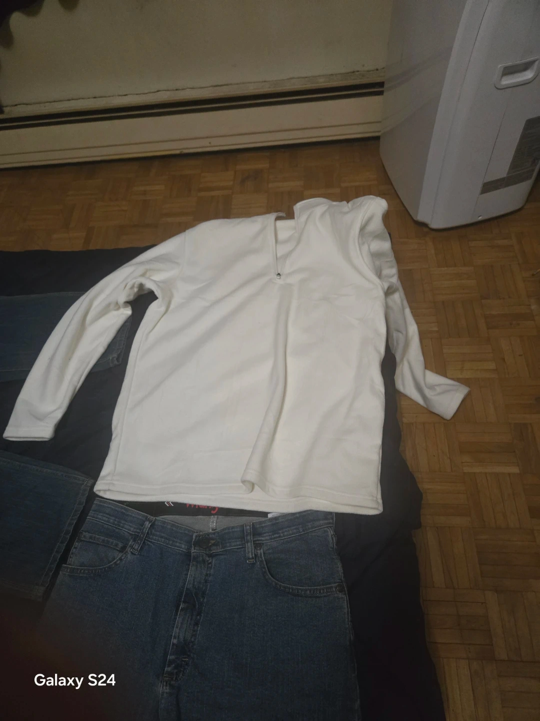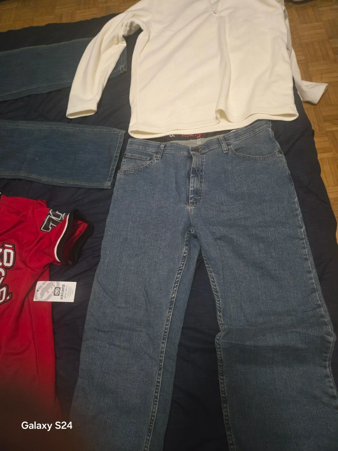 This is an Ecko Unltd. red baseball jersey. It has a button-up front with black and white trim. This jersey is great for casual wear or sporting events! Two pairs of jeans n shirt