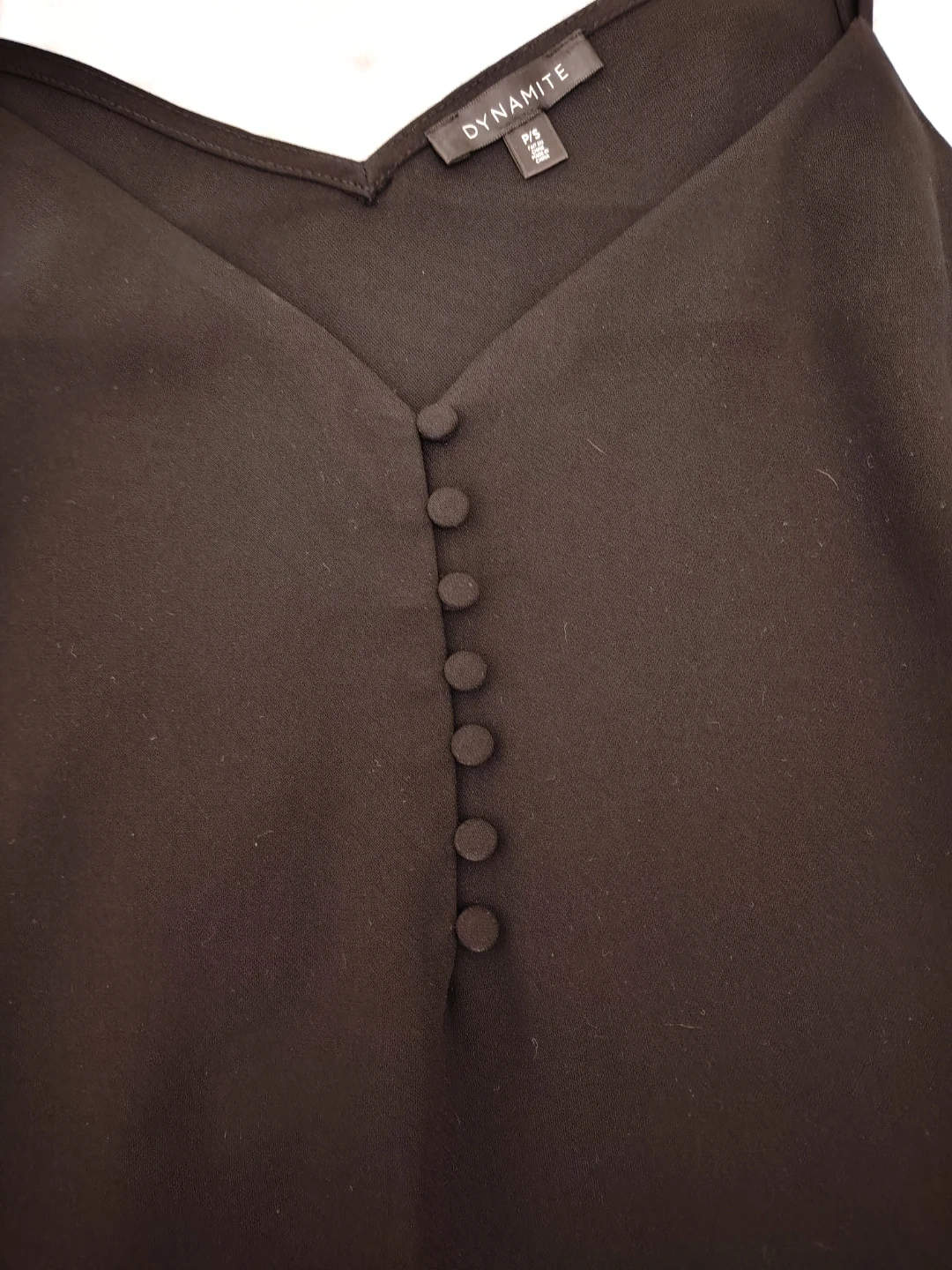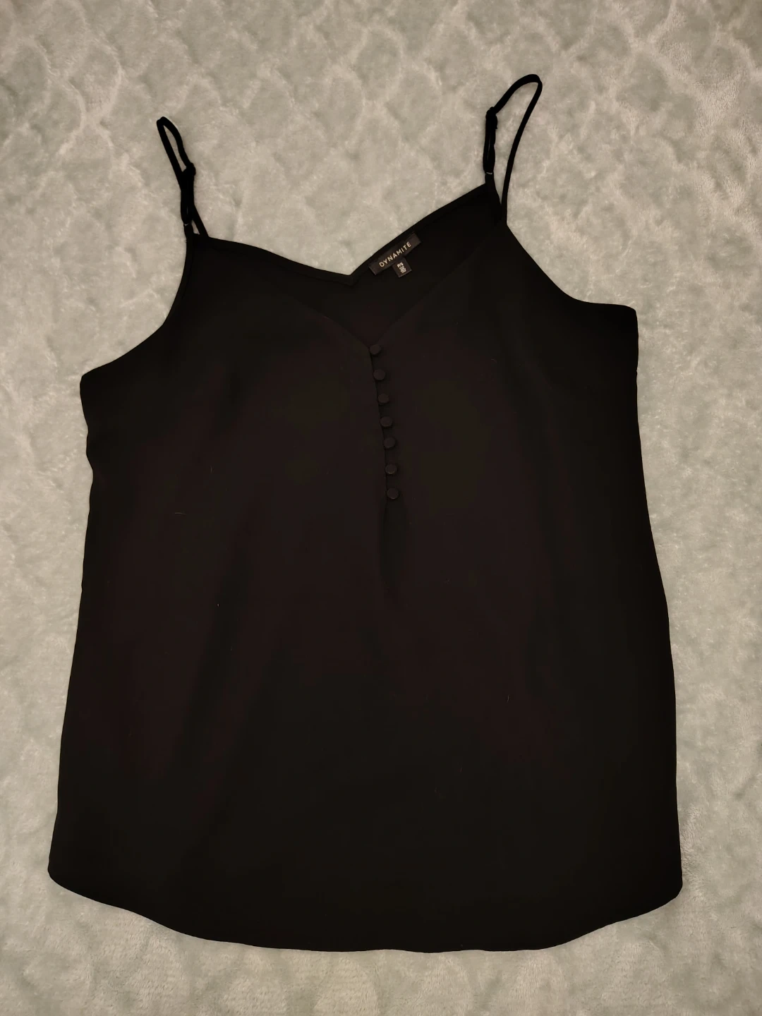 A simple black camisole top from Dynamite. It's a size P/S with adjustable spaghetti straps and a row of button detailing down the front. This top is great for layering or wearing on its own.