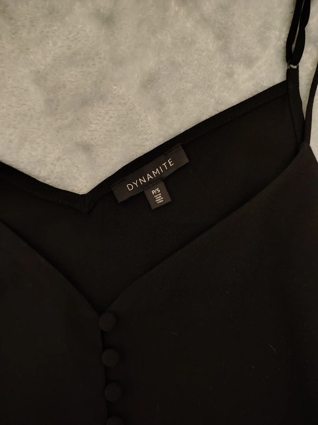A simple black camisole top from Dynamite. It's a size P/S with adjustable spaghetti straps and a row of button detailing down the front. This top is great for layering or wearing on its own.