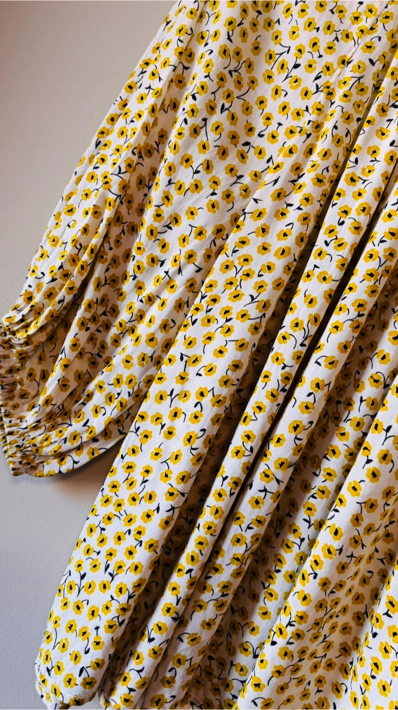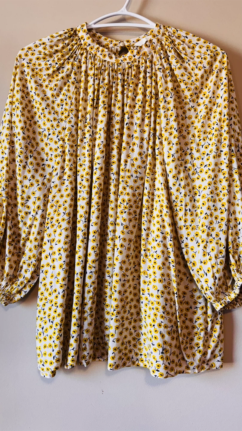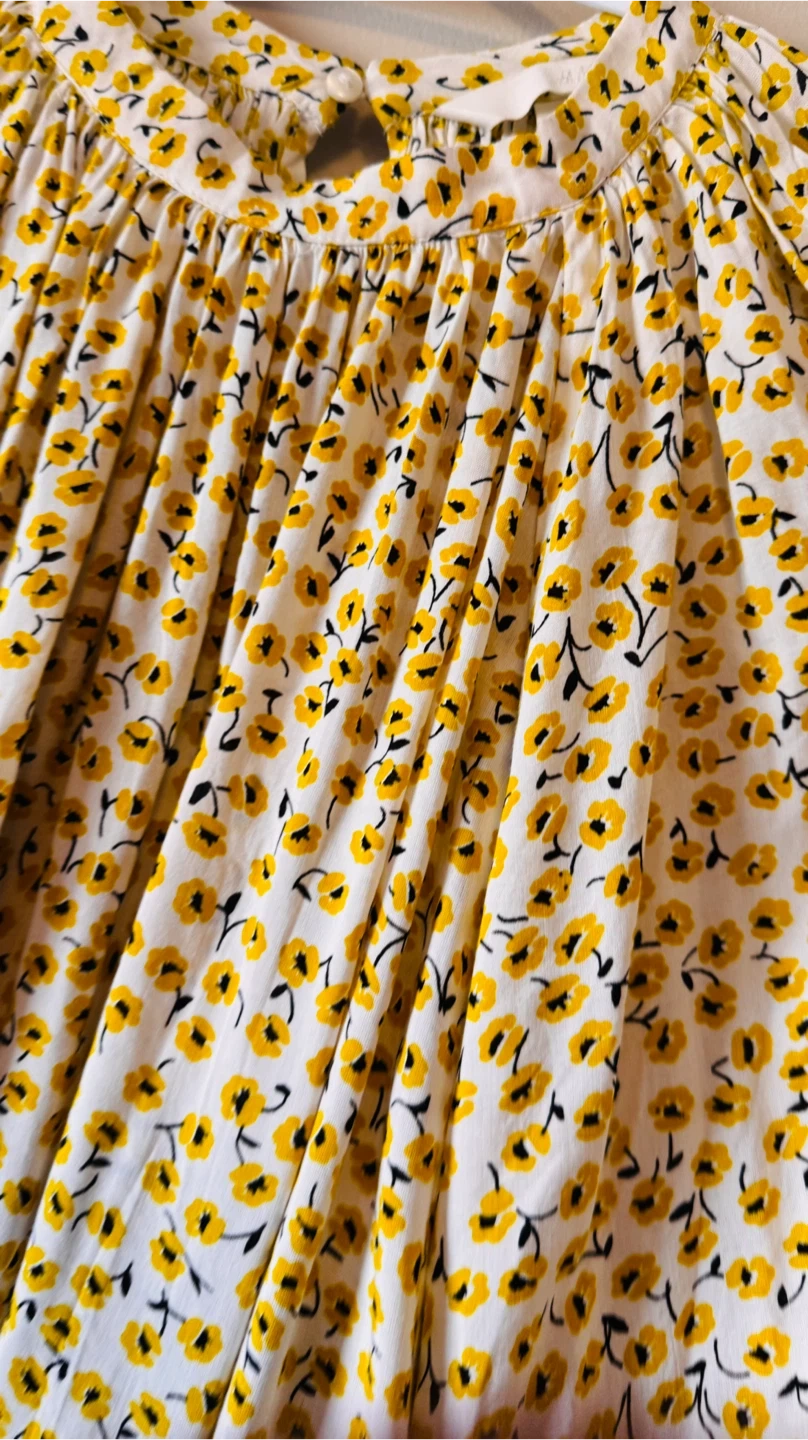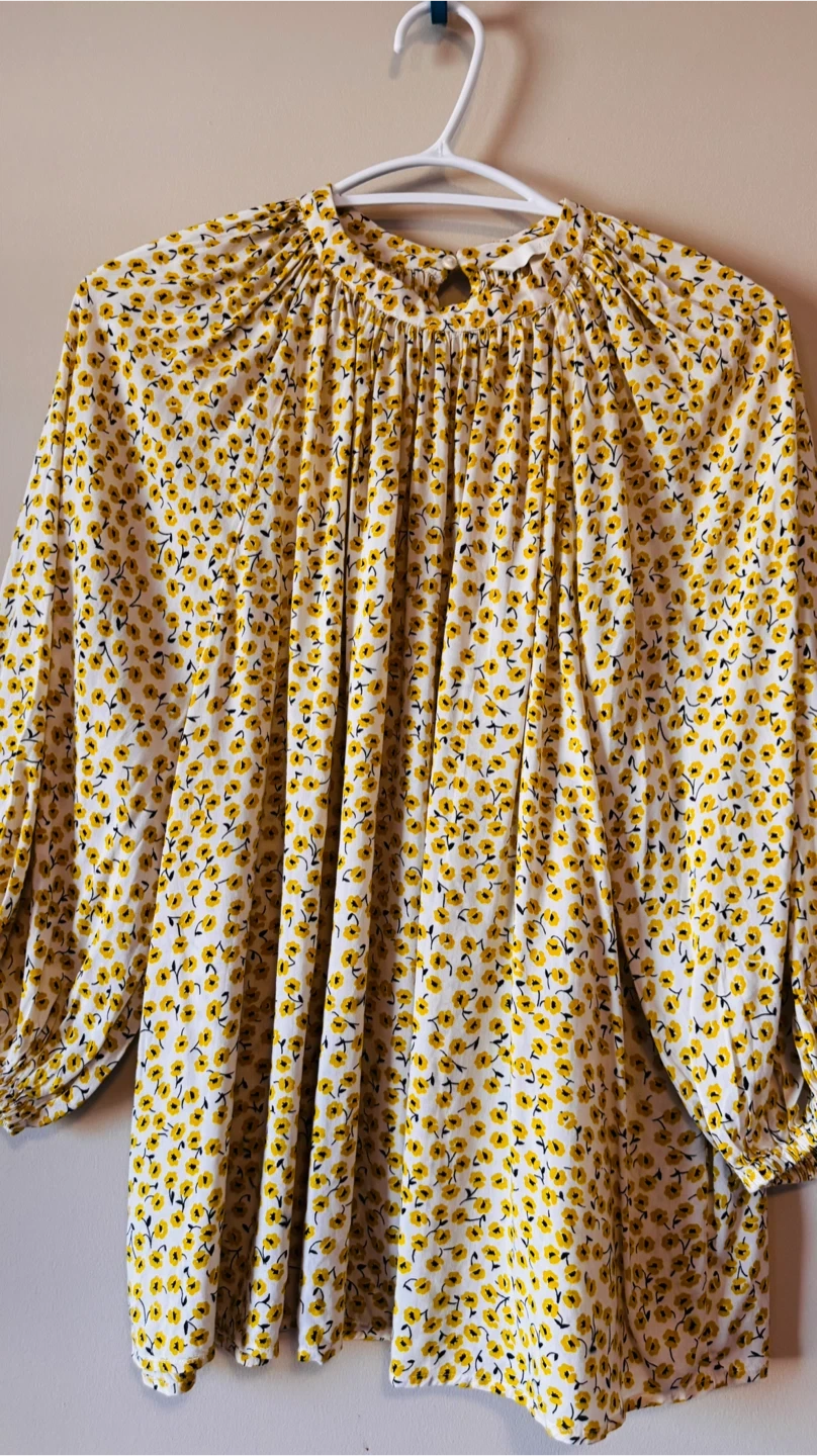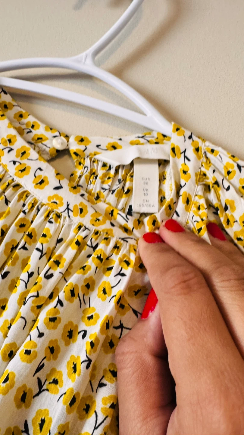 This is a cute H&M blouse with a yellow floral print on a white background. It's a size 10 Perfect for adding a pop of colour to your wardrobe!