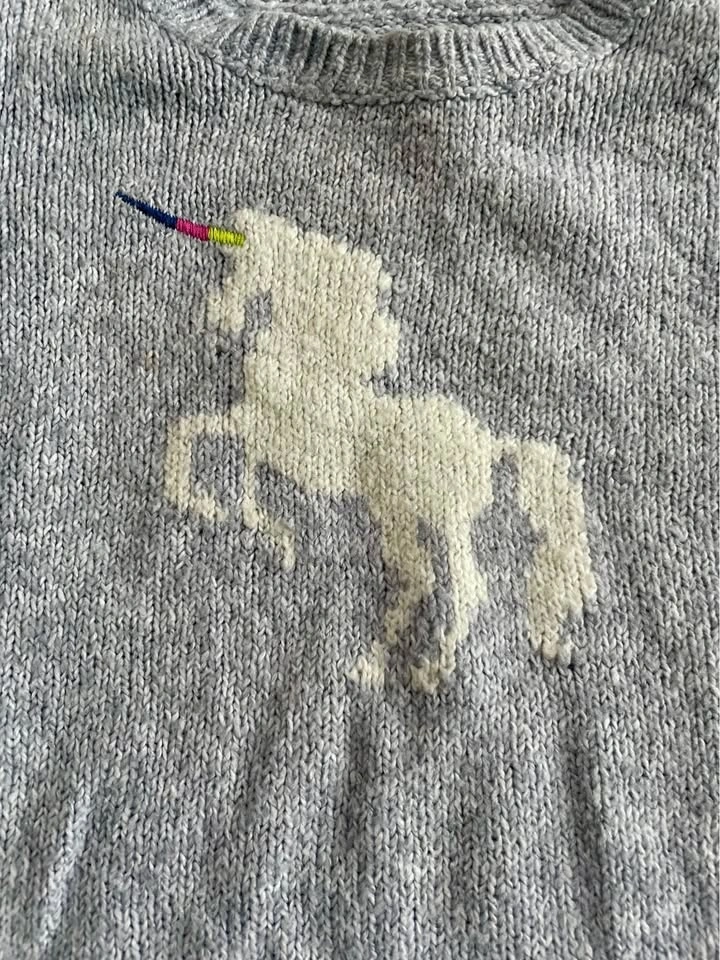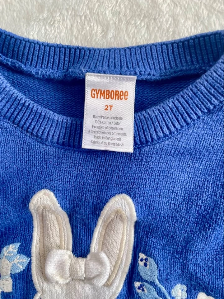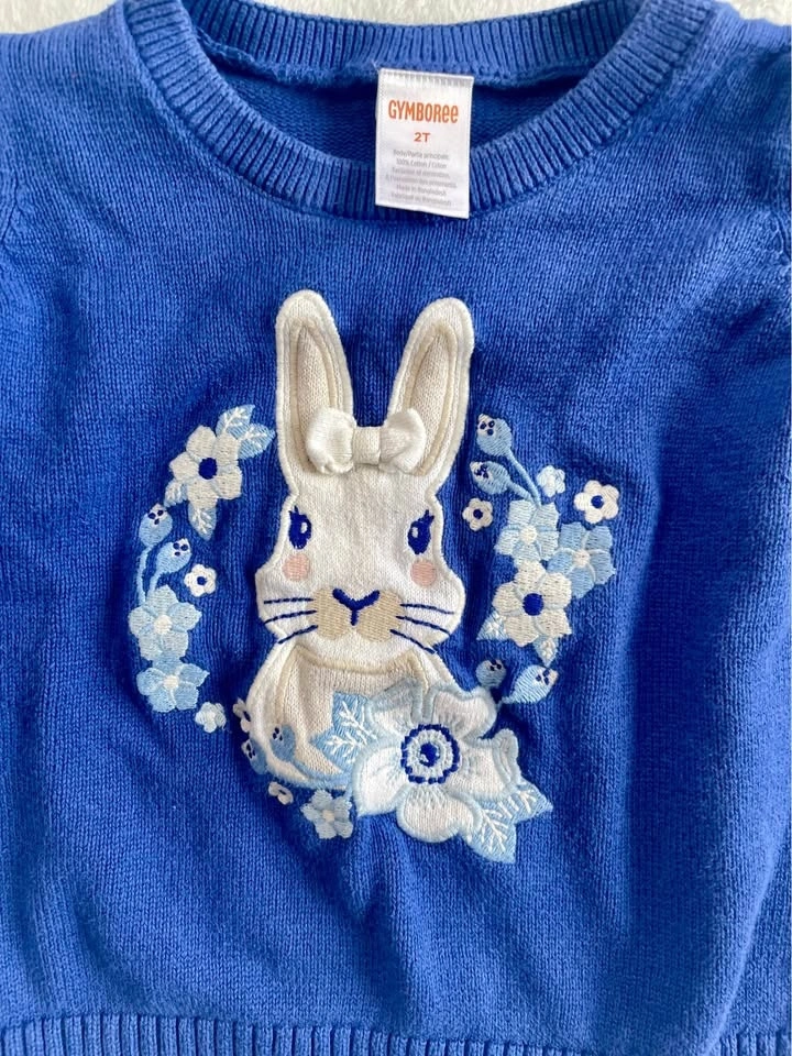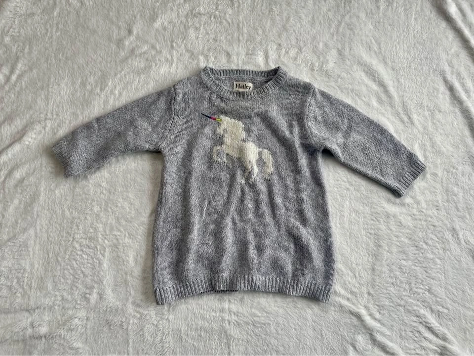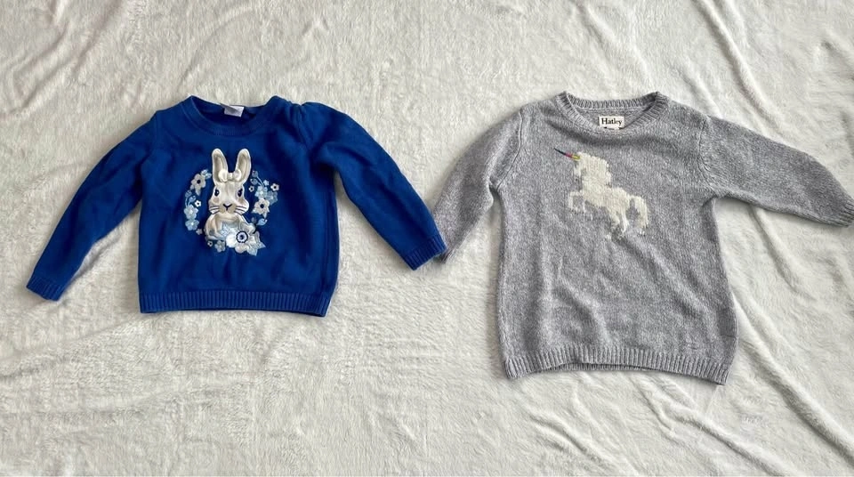 Cute toddler sweaters. Blue Gymboree sweater has sweet bunny design, size 2T, 100% cotton. The grey Hatley sweater 9-18mo has whimsical unicorn. Both in great shape, ready for cozy days.