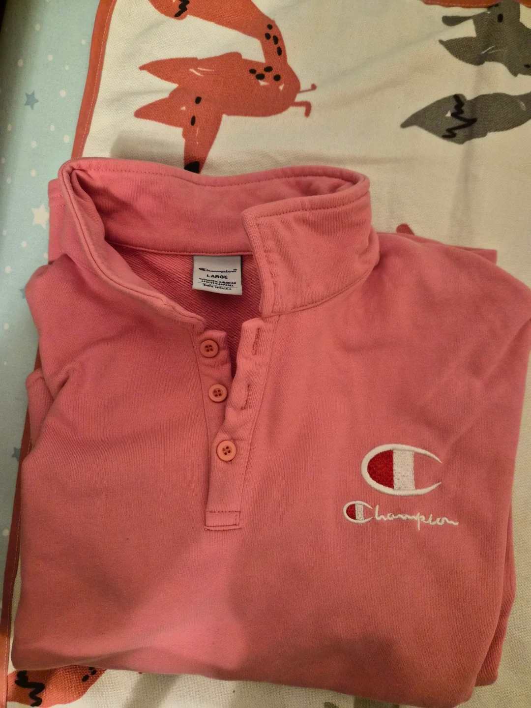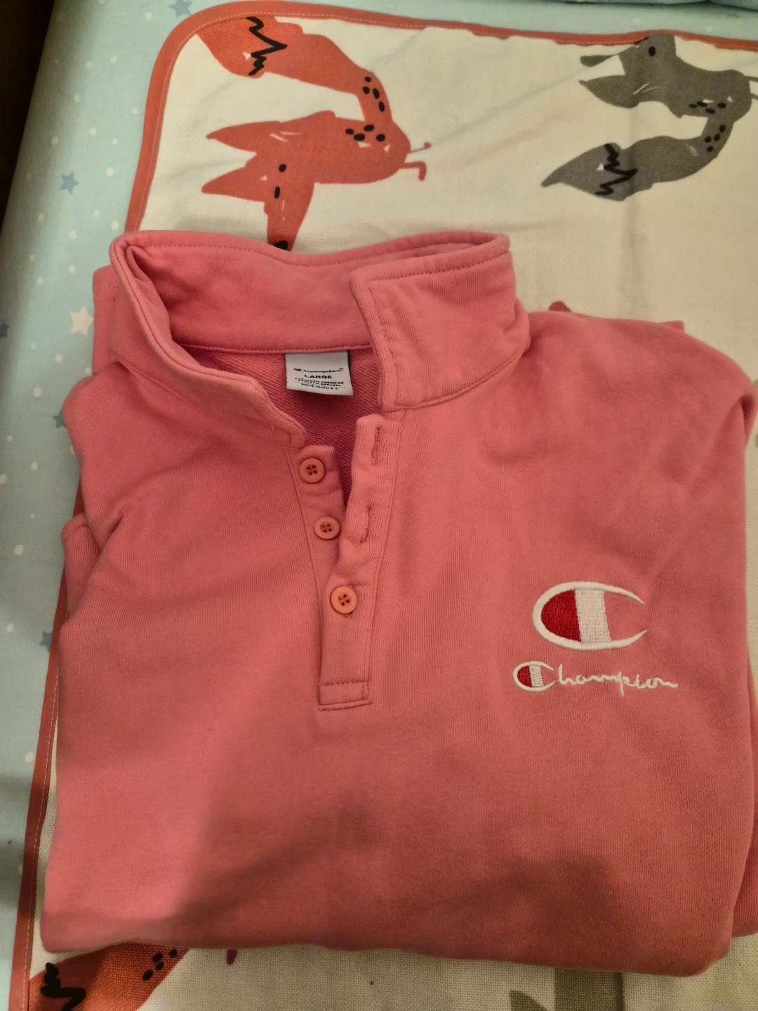 A comfy pink polo shirt from Champion. It's a size large and comes in full sleeves. Made of a soft cotton blend. Light worn and in great condition