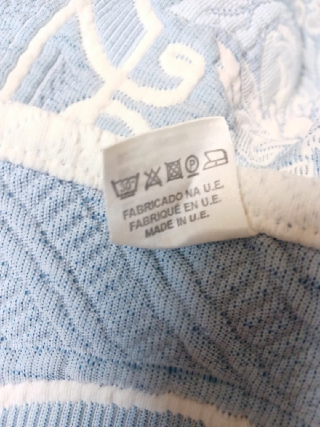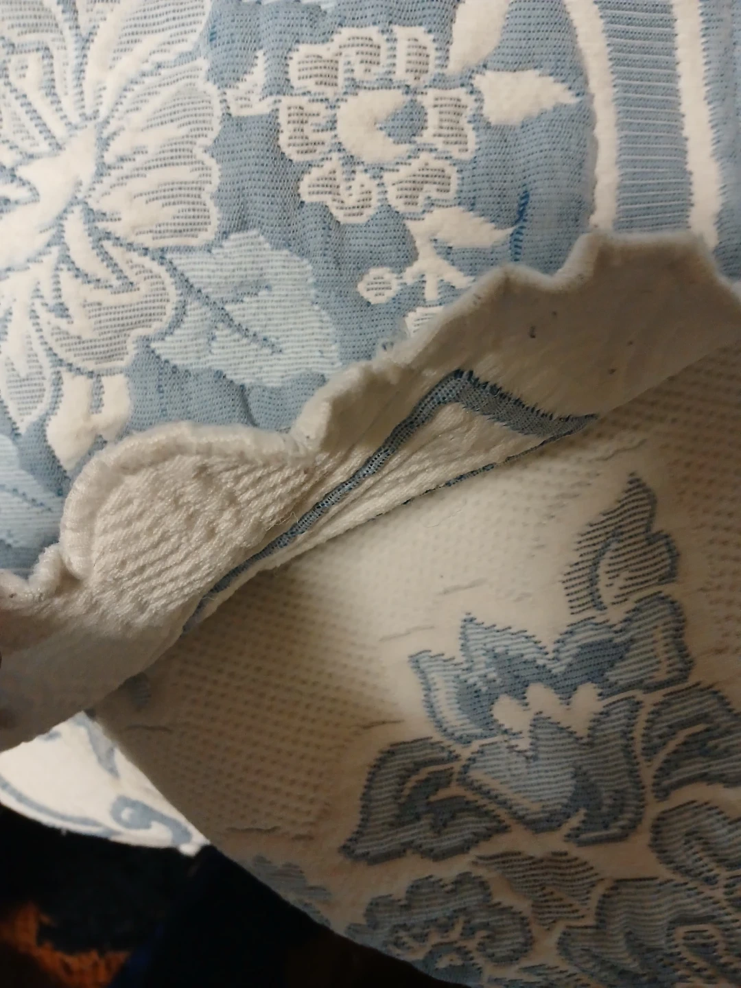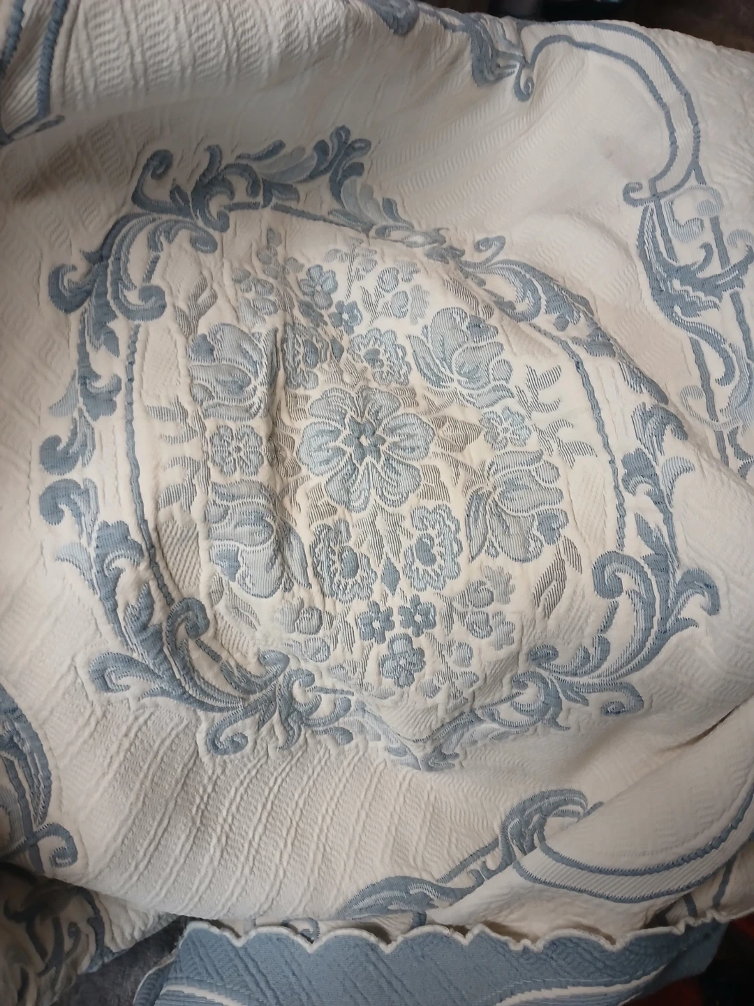 Beautiful blue and white bedspread with a lovely floral design! It's in great condition. Reversible. Cotton blend. Queen size