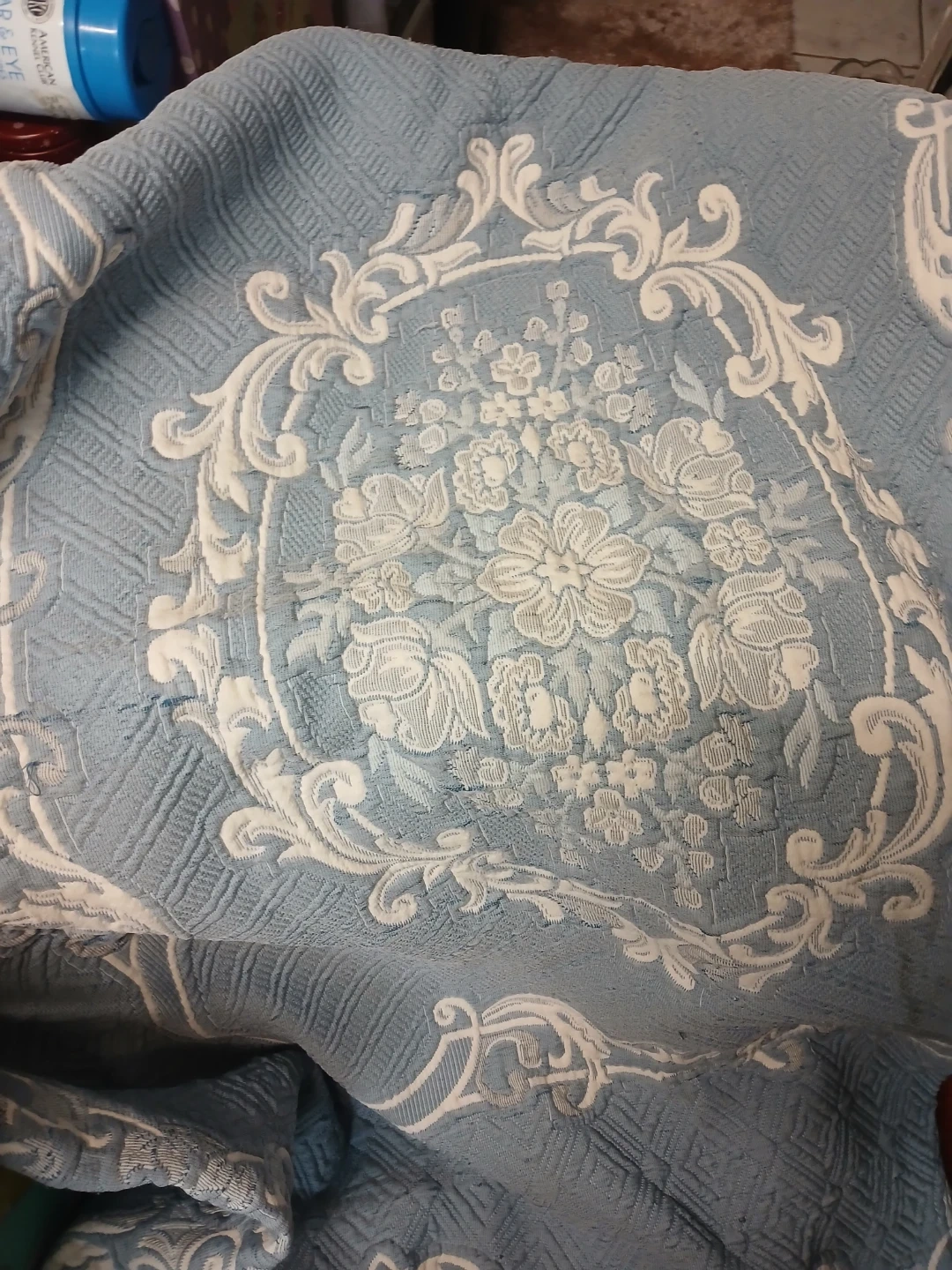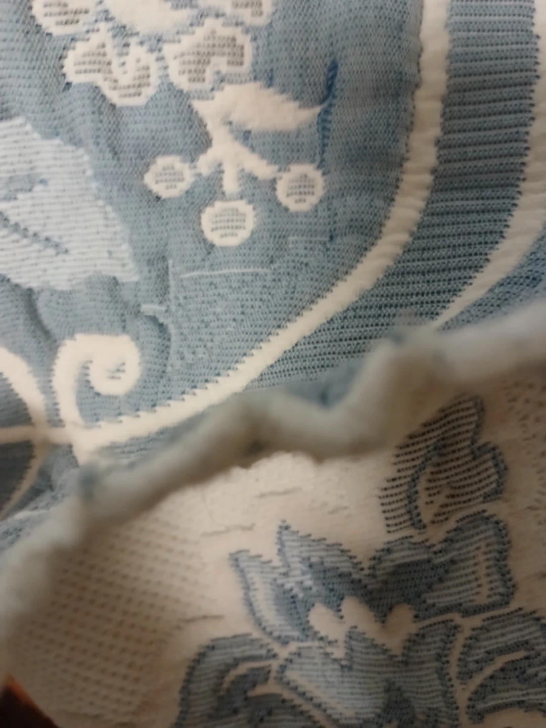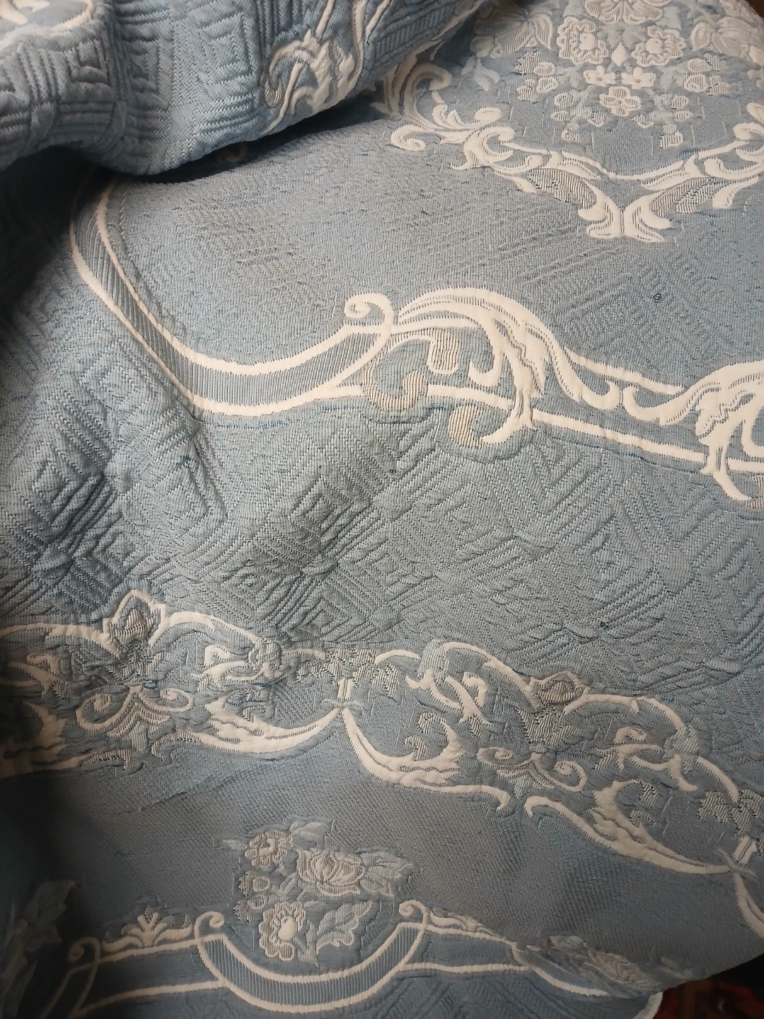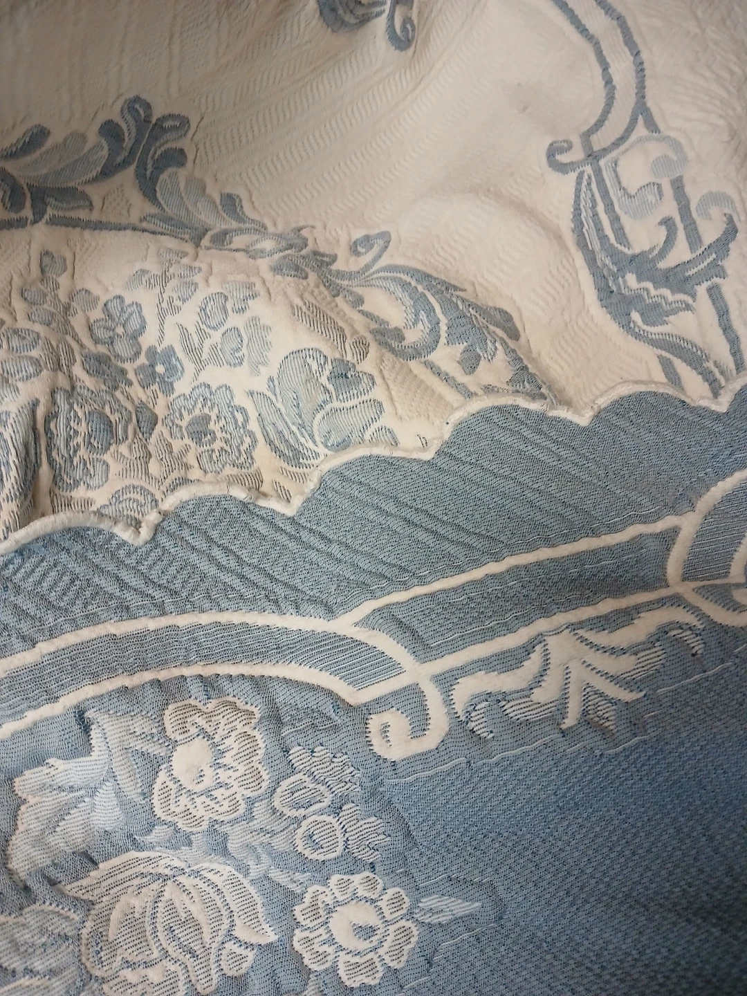 Beautiful blue and white bedspread with a lovely floral design! It's in great condition. Reversible. Cotton blend. Queen size