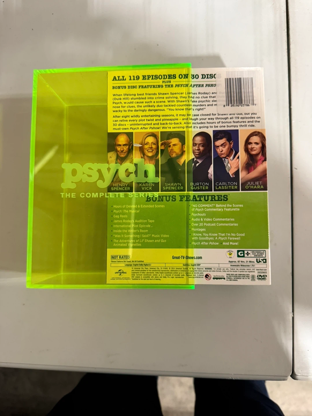 All 119 episodes of Psych on 30 discs. Includes bonus features like deleted scenes and commentaries. This complete series box set is a must-have for any fan!