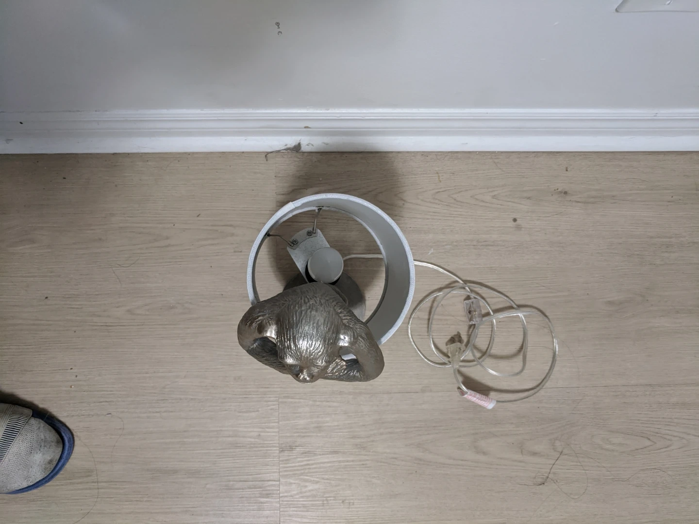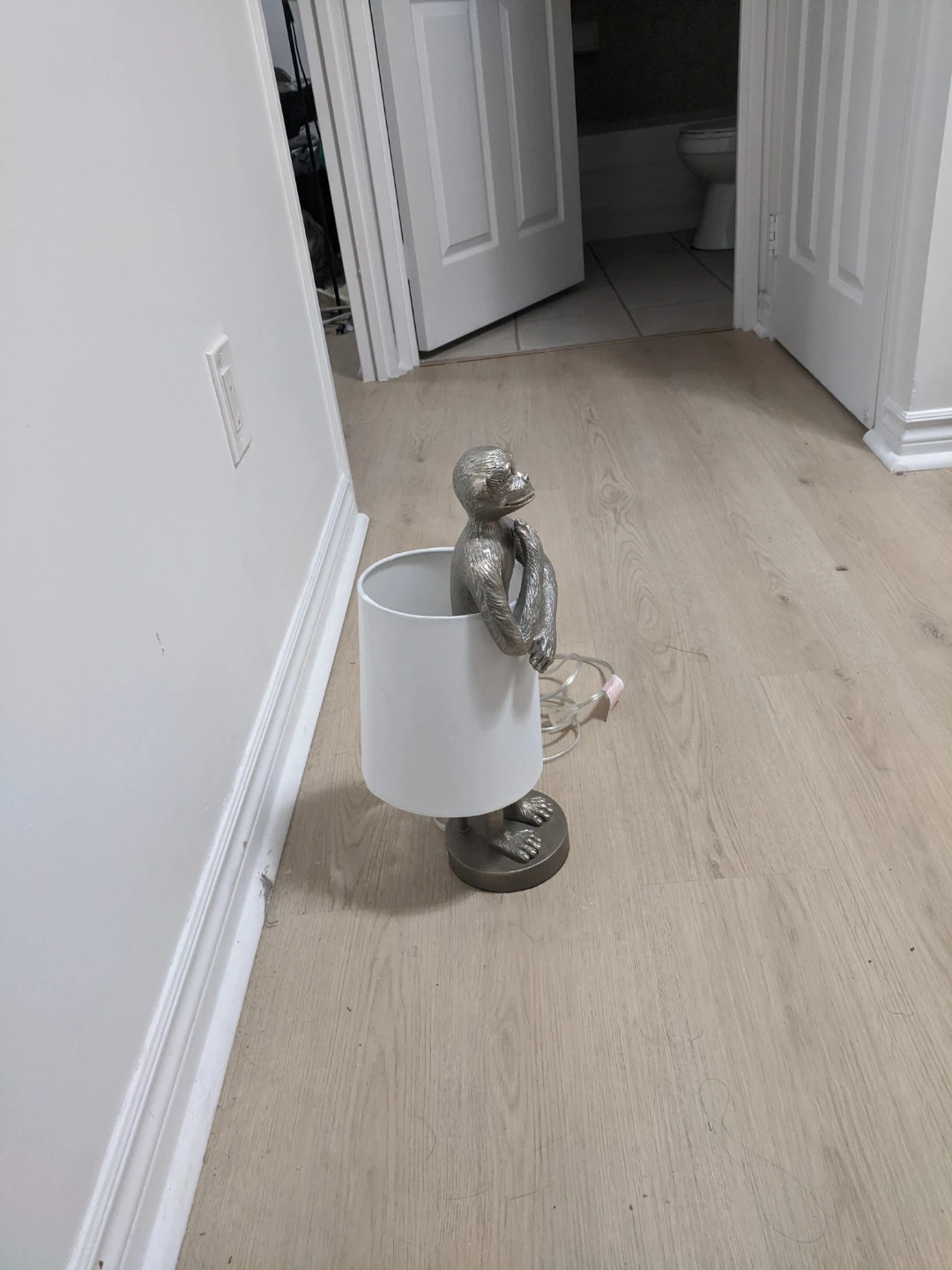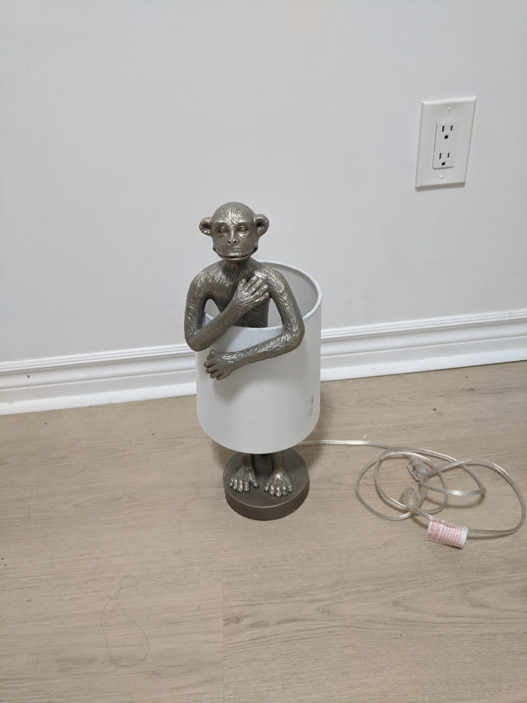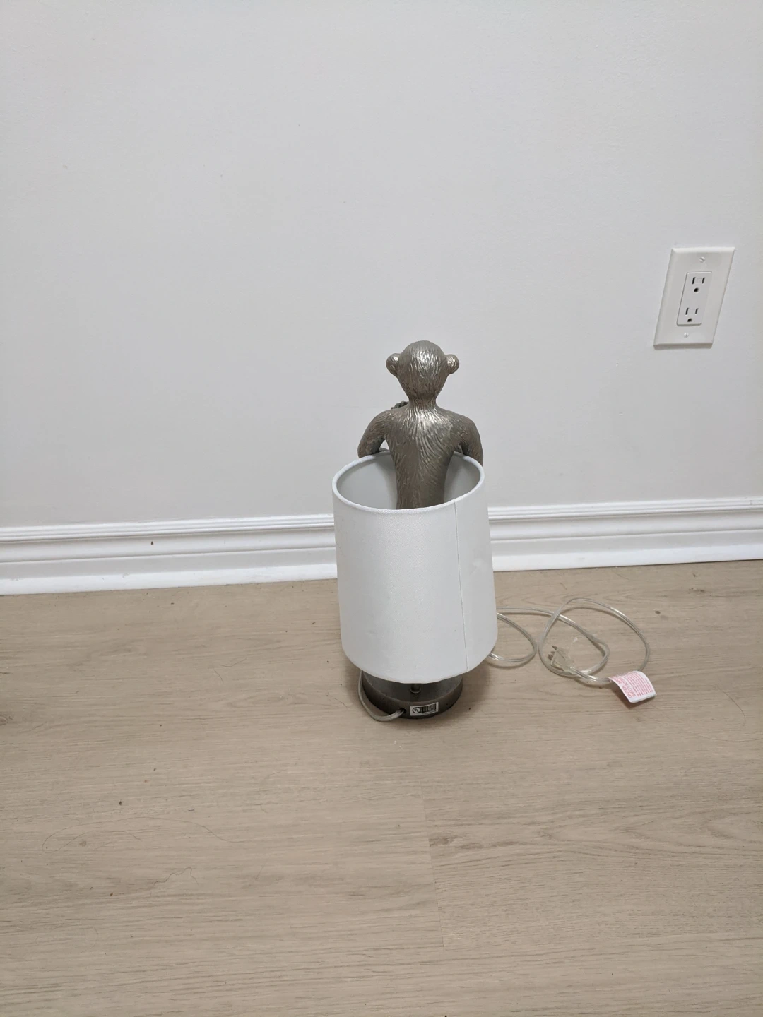 This is a unique table lamp shaped like a monkey peeking out of a lampshade. It uses a Type B bulb and is rated for a maximum of 15 watts. It's a fun accent piece for any room! Pick up at 195 Merton Street Toronto or pick up at Subway station Davisivill. And I can deliver it to your house but you need to pay me another $3. Thanks.
