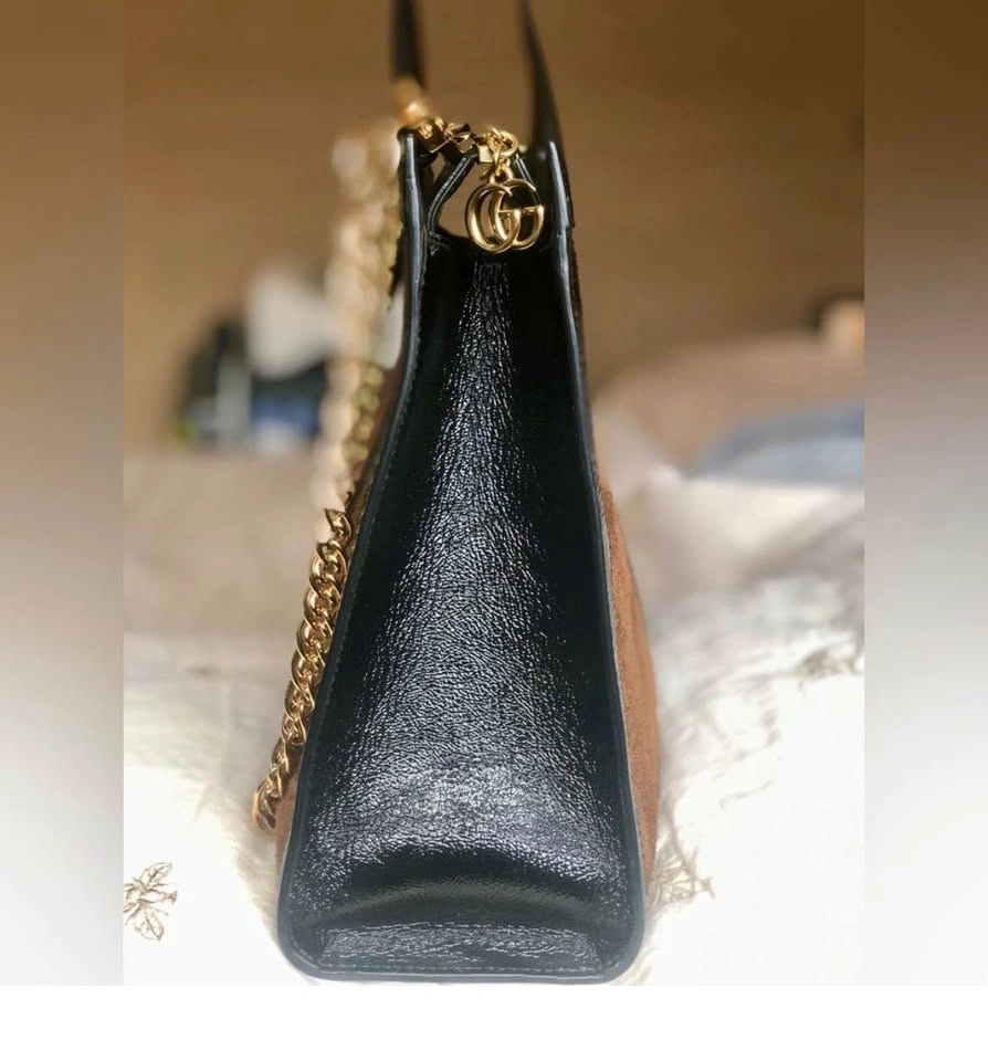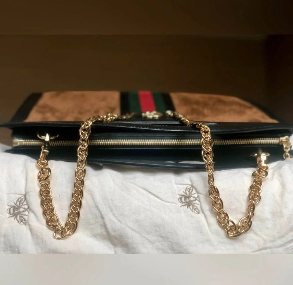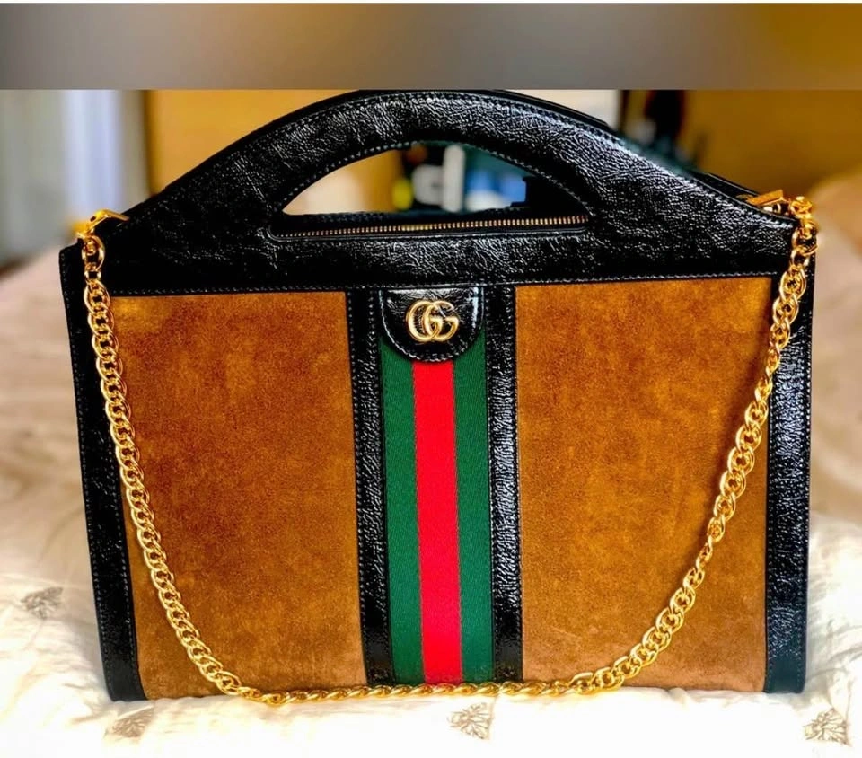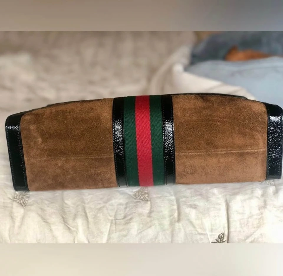 Gorgeous Gucci bag. Brown suede and black patent leather with the iconic green and red stripe. Features a gold GG logo on the front, a top handle, and a gold chain strap.
