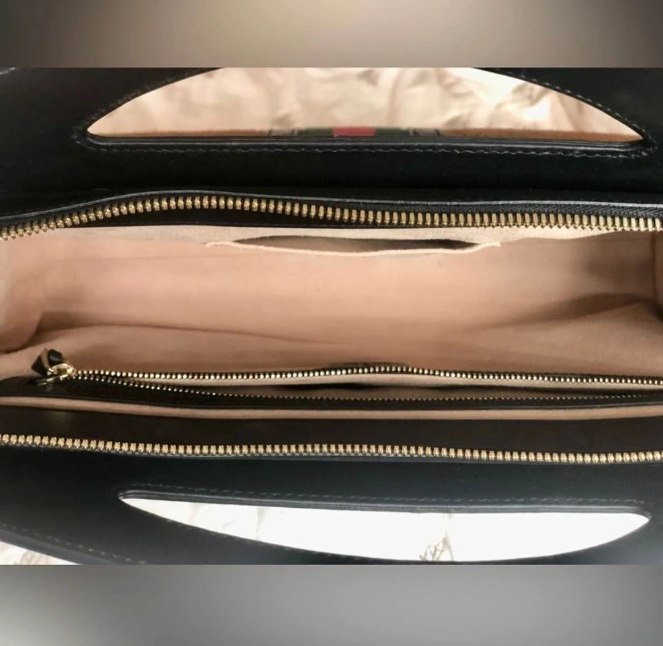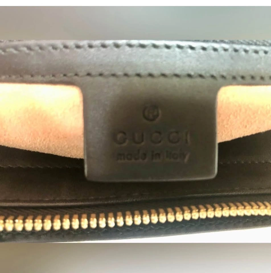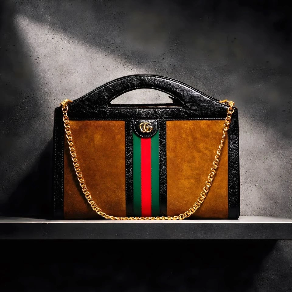Gorgeous Gucci bag. Brown suede and black patent leather with the iconic green and red stripe. Features a gold GG logo on the front, a top handle, and a gold chain strap.