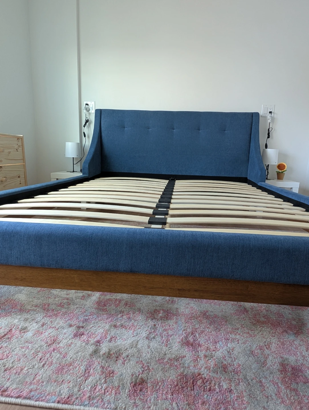 Selling a queen size bed frame with a blue upholstered headboard and frame! The frame is in great condition and ready for a new home!