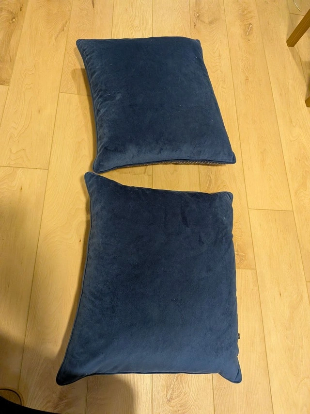 Add a touch of elegance to your living room or bedroom with this beautiful set of high-quality decorative pillows from Rodeo Home. These are reversible, featuring a rich blue velvet on one side and a sophisticated blue/grey woven texture on the other. Brand: Rodeo Home. Dimensions: Approx. 20" x 20". Our Price: $30 for the pair. Condition: Excellent used condition, very clean. Features: Hidden zipper closures and high-quality filling. Regular Price: Similar Rodeo Home luxury pillows retail for $75+ each. Cash accepted. Let me know if you're interested!