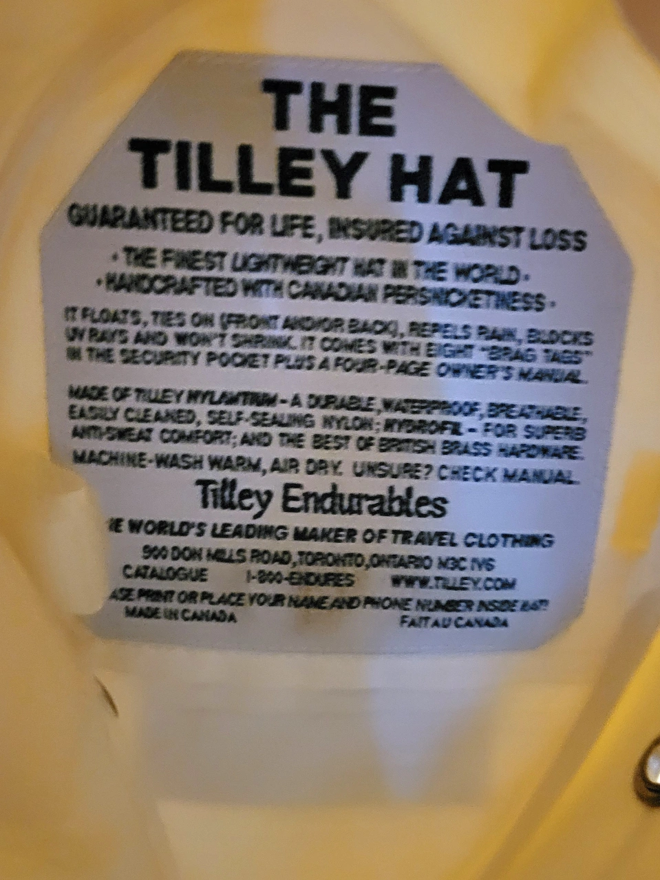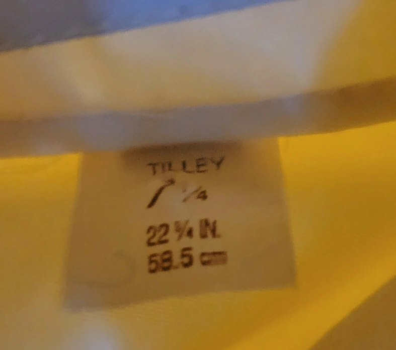 Selling a Tilley Hat in size 7 1/4 (22 1/4 inches or 59.5 cm). This hat is guaranteed for life and insured against loss! It's handcrafted with Canadian Persnicketiness and is the finest lightweight hat in the world. It floats, ties on (front and/or back), repels rain, blocks UV rays, Made of Tilley Nylamtium - a durable, waterproof, breathable, easily cleaned, self-sealing nylon; Hydrofil - for superb anti-sweat comfort; and the best of British brass hardware. It's machine-washable, warm air dry.