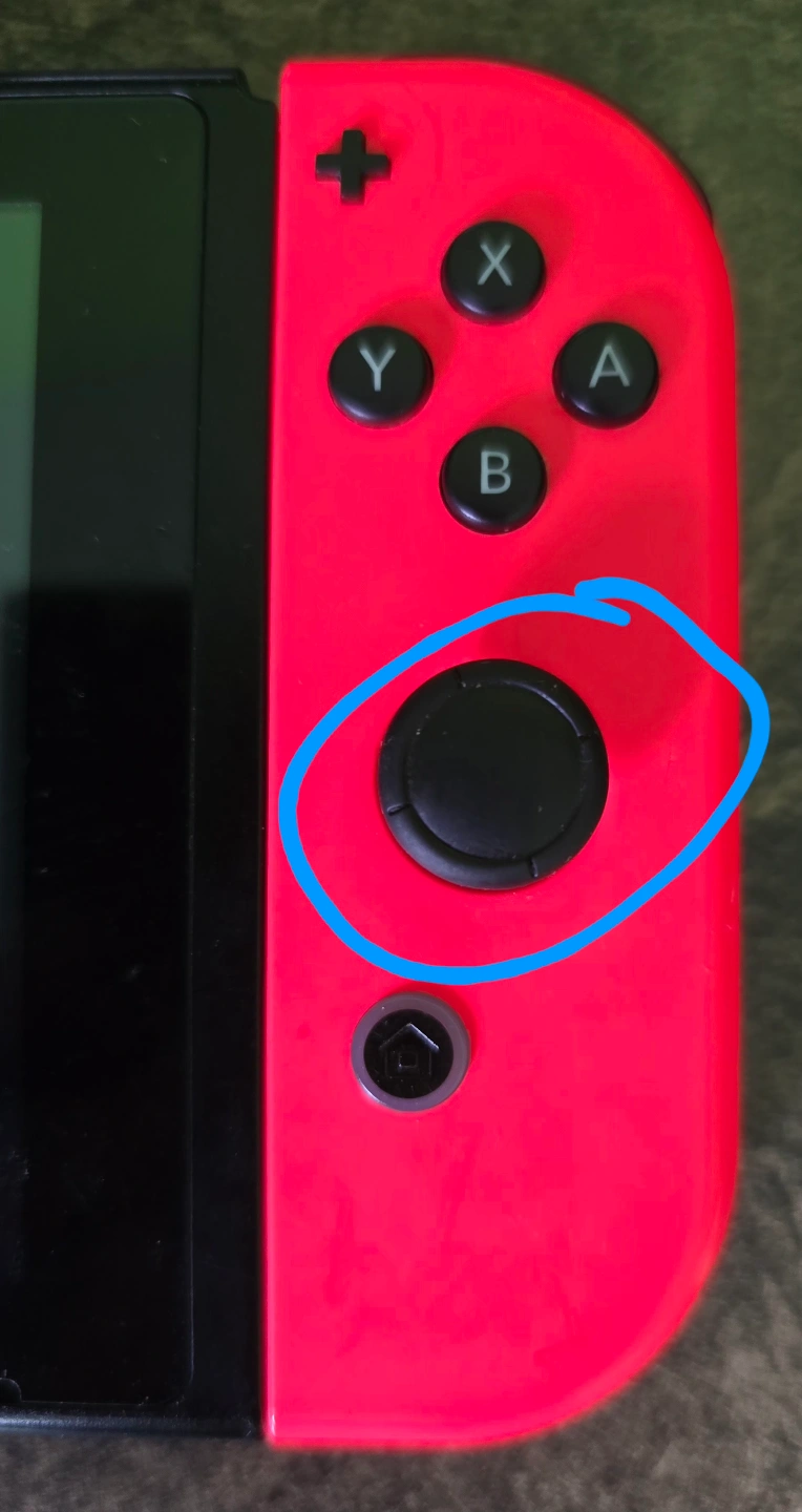 The blue circle on the red joycon is not fully functional. It works when moving it but pressing on it like a button does not work, everything else fully functional.