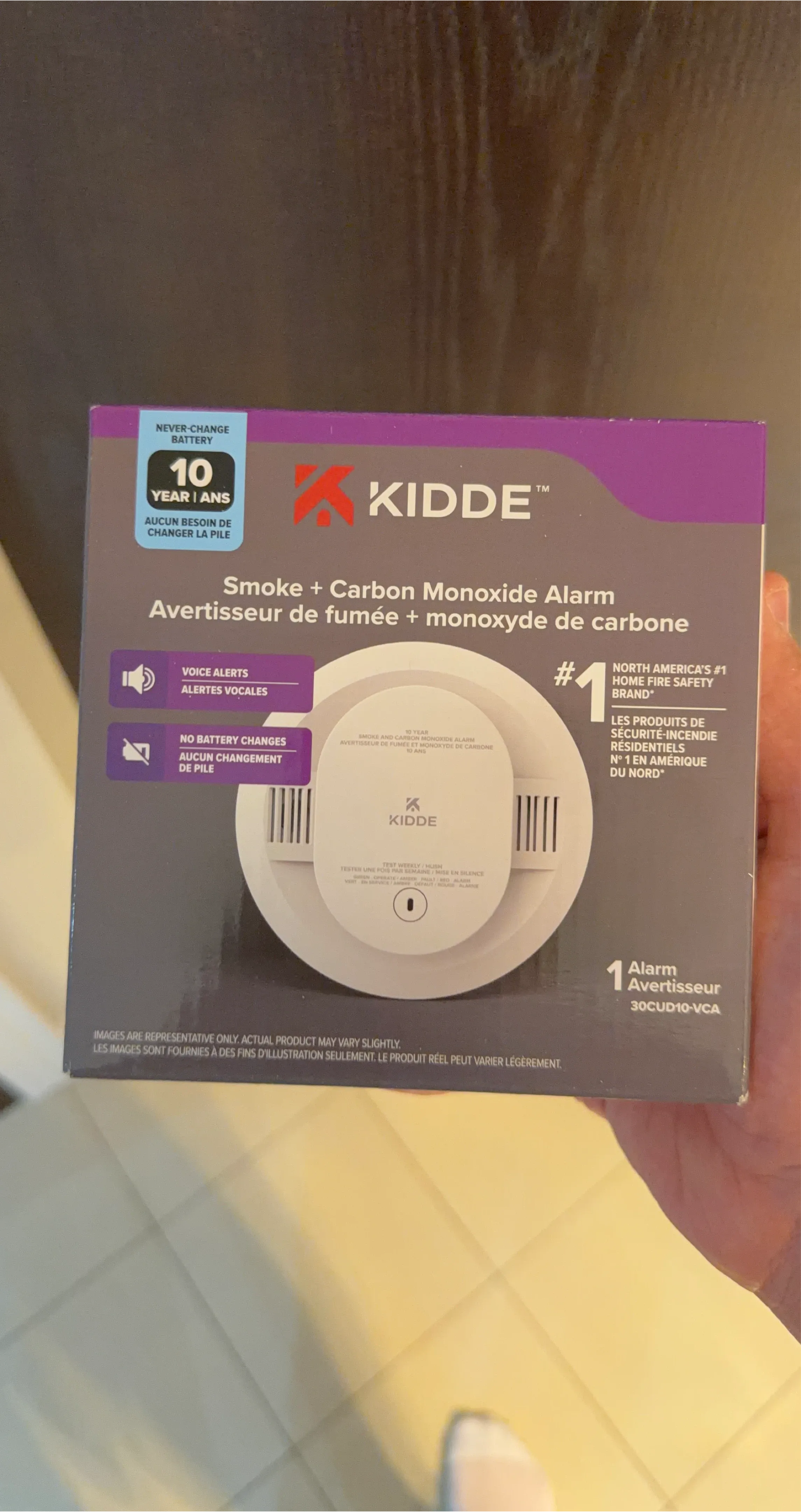 This is a Kidde smoke and carbon monoxide alarm with a 10-year never-change battery. It features voice alerts and no battery changes are needed. The model number is 30CUD10-VCA.