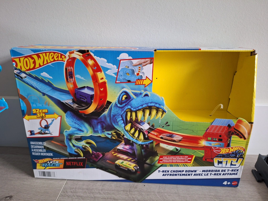 Selling a Hot Wheels City T-Rex Chomp Down track set! It includes the T-Rex, track pieces, and a launcher to send your cars flying through the loop and past the chomping dino. The box is included too!
