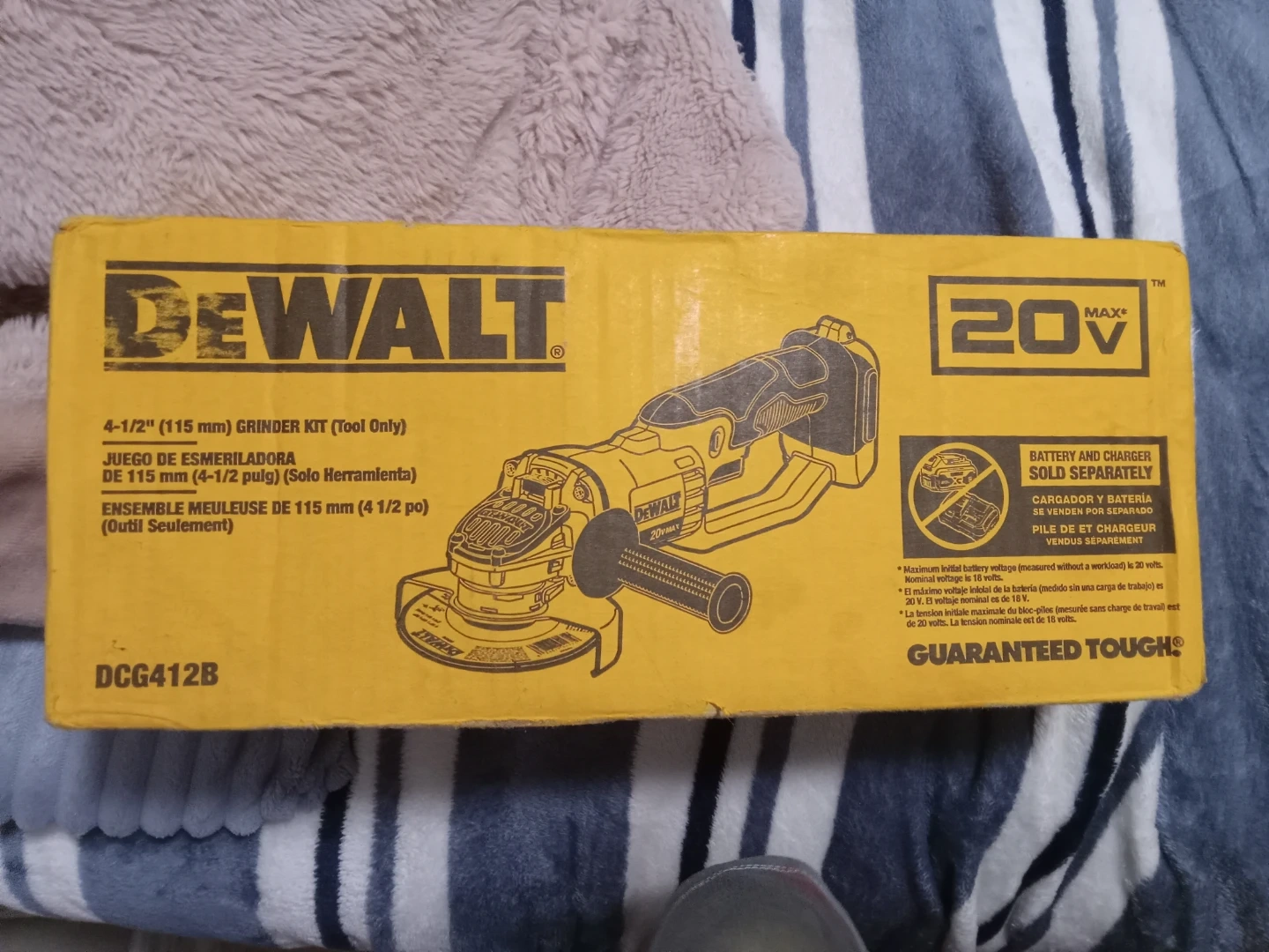 This is a DEWALT 20V MAX 4-1/2" (115 mm) grinder kit, model DCG412B. It's a tool-only package, meaning the battery and charger are sold separately. It's designed for efficient cutting and grinding tasks.