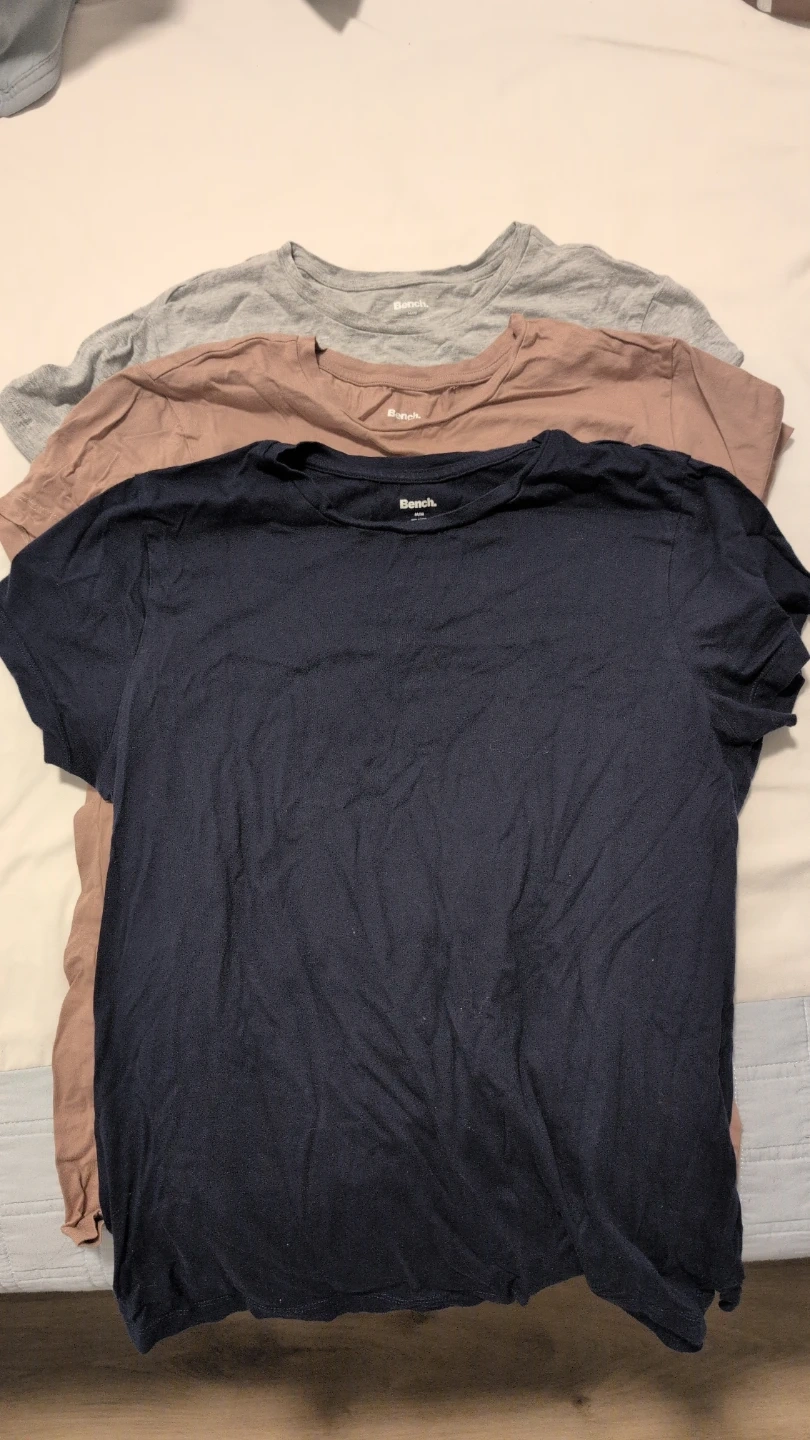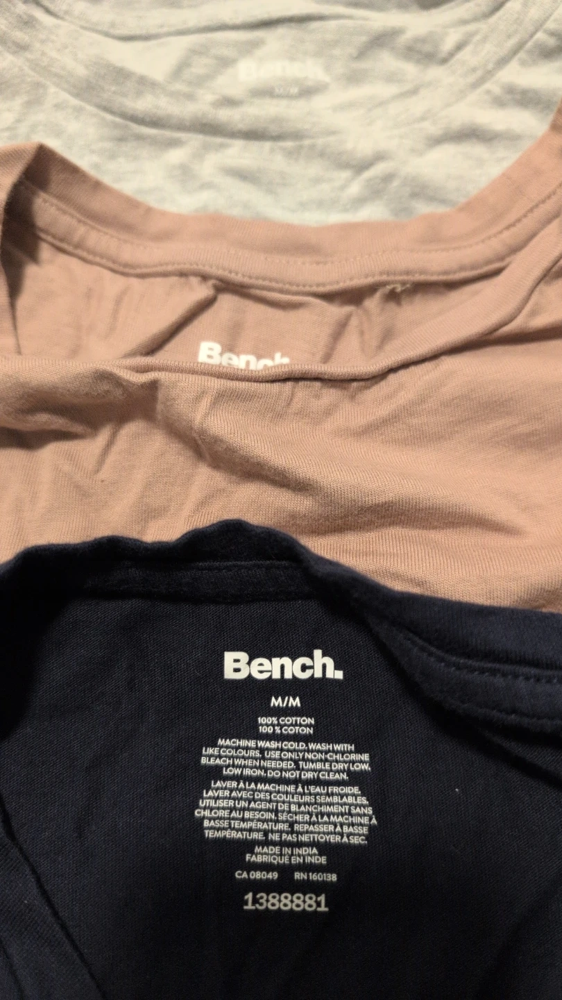 Three Bench. t-shirts in size M/M. Two are solid colours, one is a muted rose and one is grey. The third is navy blue. 100% cotton material. Made in India.