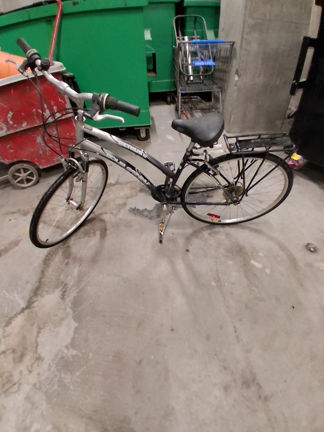 This is a Louis Garneau bicycle with 21 speeds and Shimano components. It's made of Cromoly and was designed in Canada. The frame is silver and black. It has a rear rack for carrying items.
