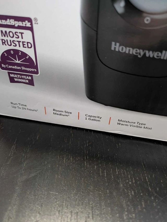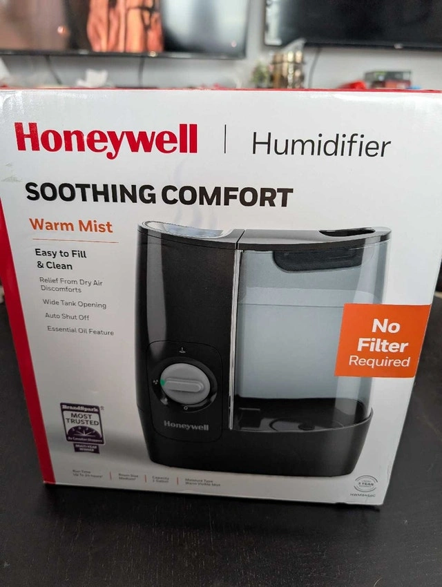 I'm selling a Brand New never opened Honeywell Soothing Comfort warm mist humidifier. This filter-free unit is designed for medium-sized rooms and runs for up to 24 hours on a single fill of its 1-gallon tank. It's got two comfort settings, an essential oil cup for aromatherapy, and even an auto shut-off feature for when the tank is empty.