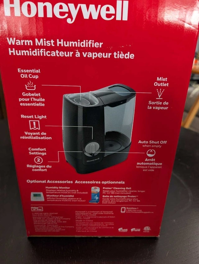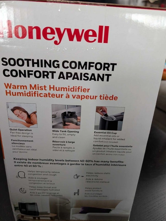 I'm selling a Brand New never opened Honeywell Soothing Comfort warm mist humidifier. This filter-free unit is designed for medium-sized rooms and runs for up to 24 hours on a single fill of its 1-gallon tank. It's got two comfort settings, an essential oil cup for aromatherapy, and even an auto shut-off feature for when the tank is empty.