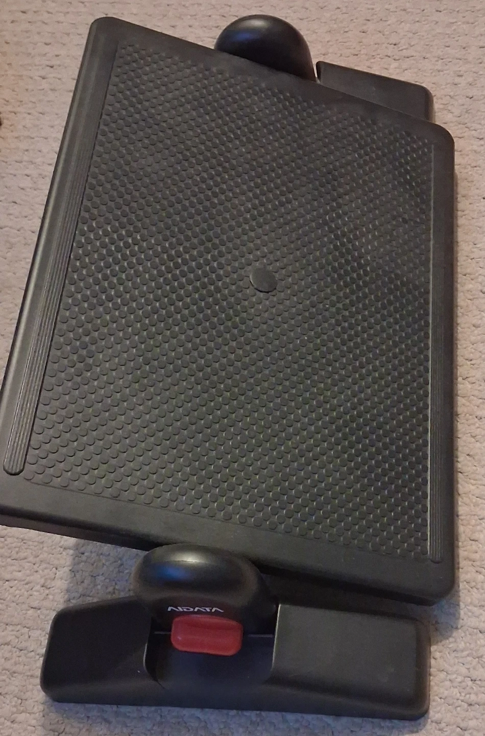 Black Aidata swivel footrest. It's made of durable plastic. This footrest is adjustable for height and tilt. Swivels for comfort!