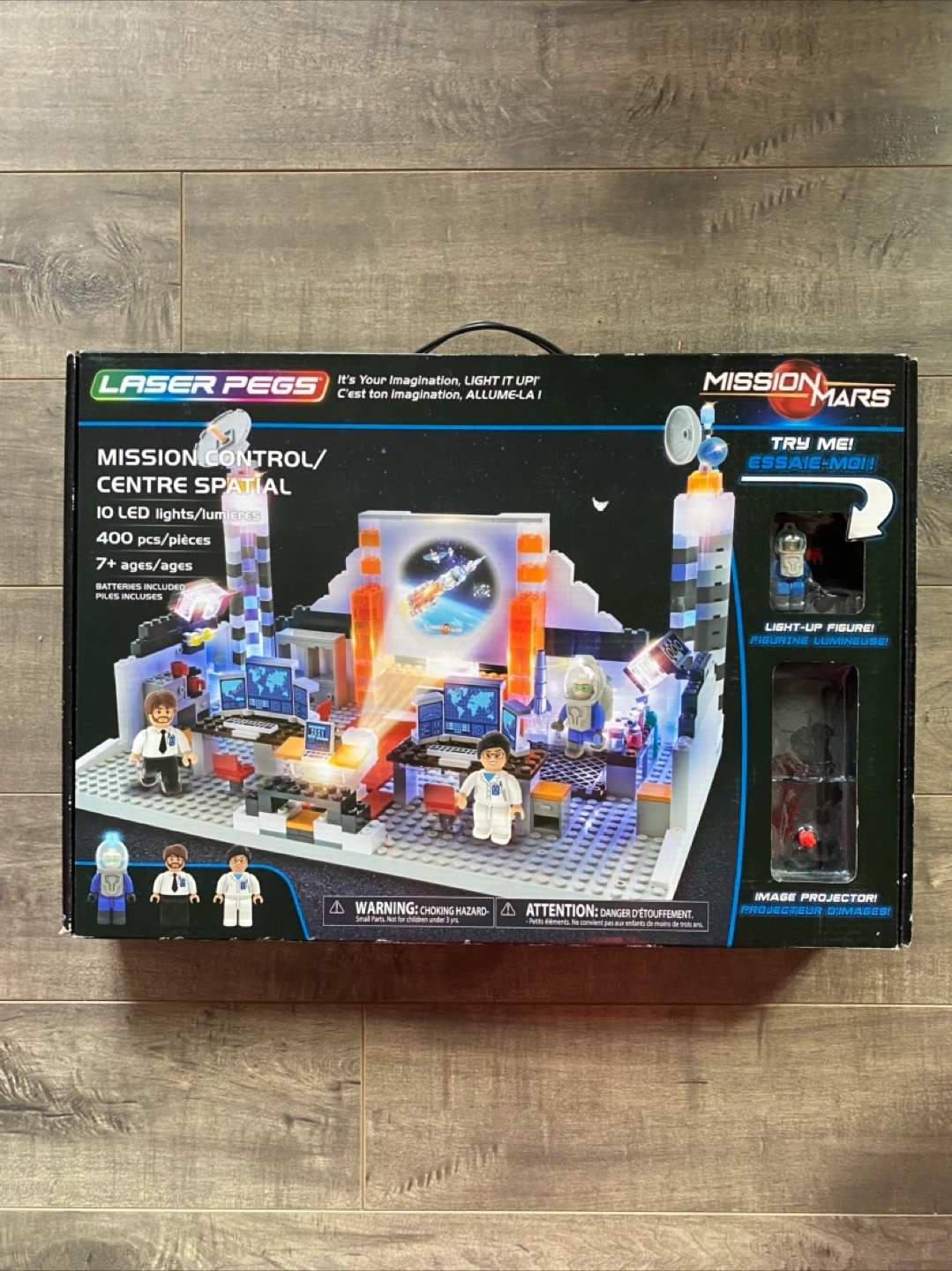 This Laser Pegs Mission Control Centre Spatial set comes with 10 LED lights and 400 pieces. It's recommended for ages 7 and up. Batteries are included for the light-up figure and image projector!